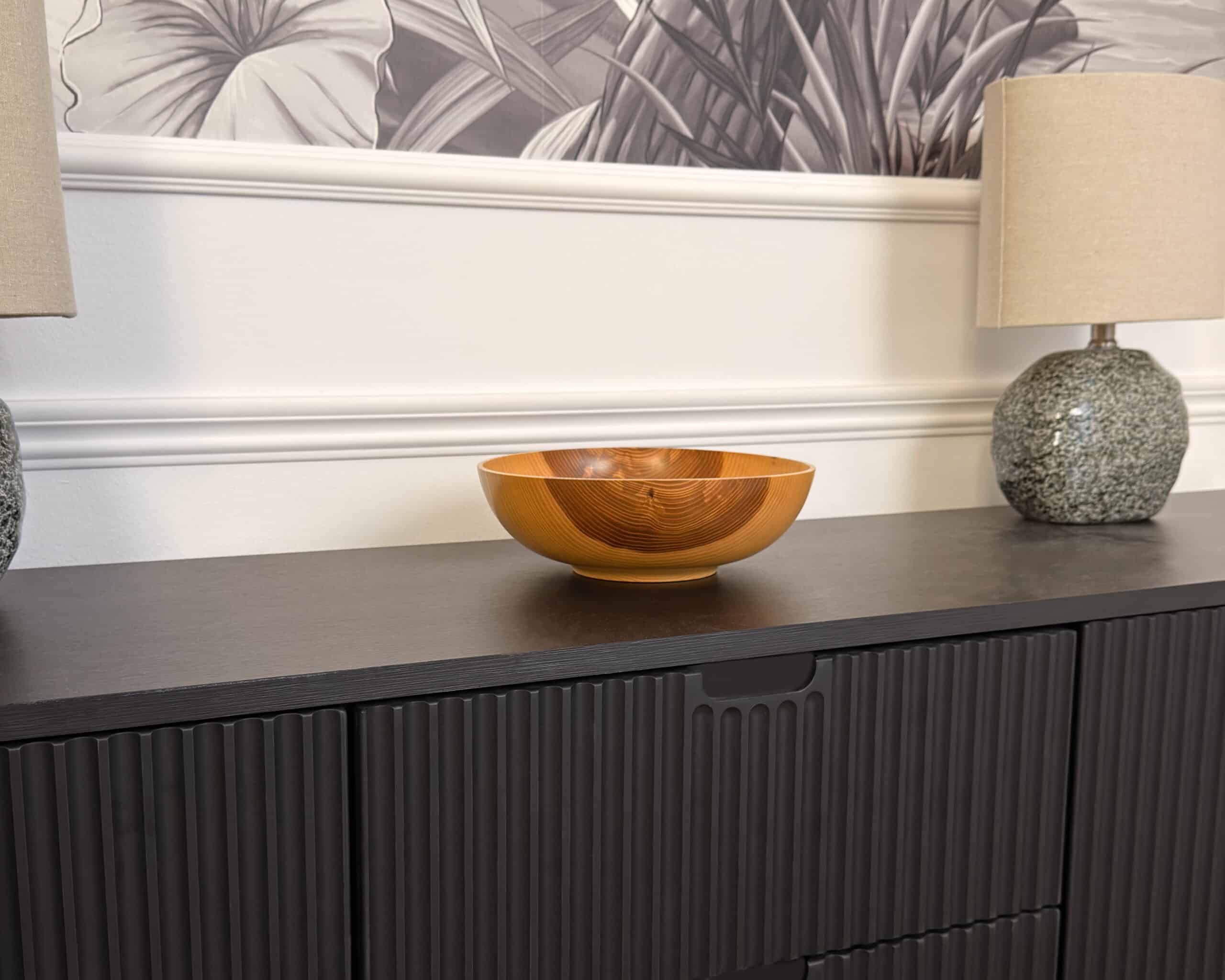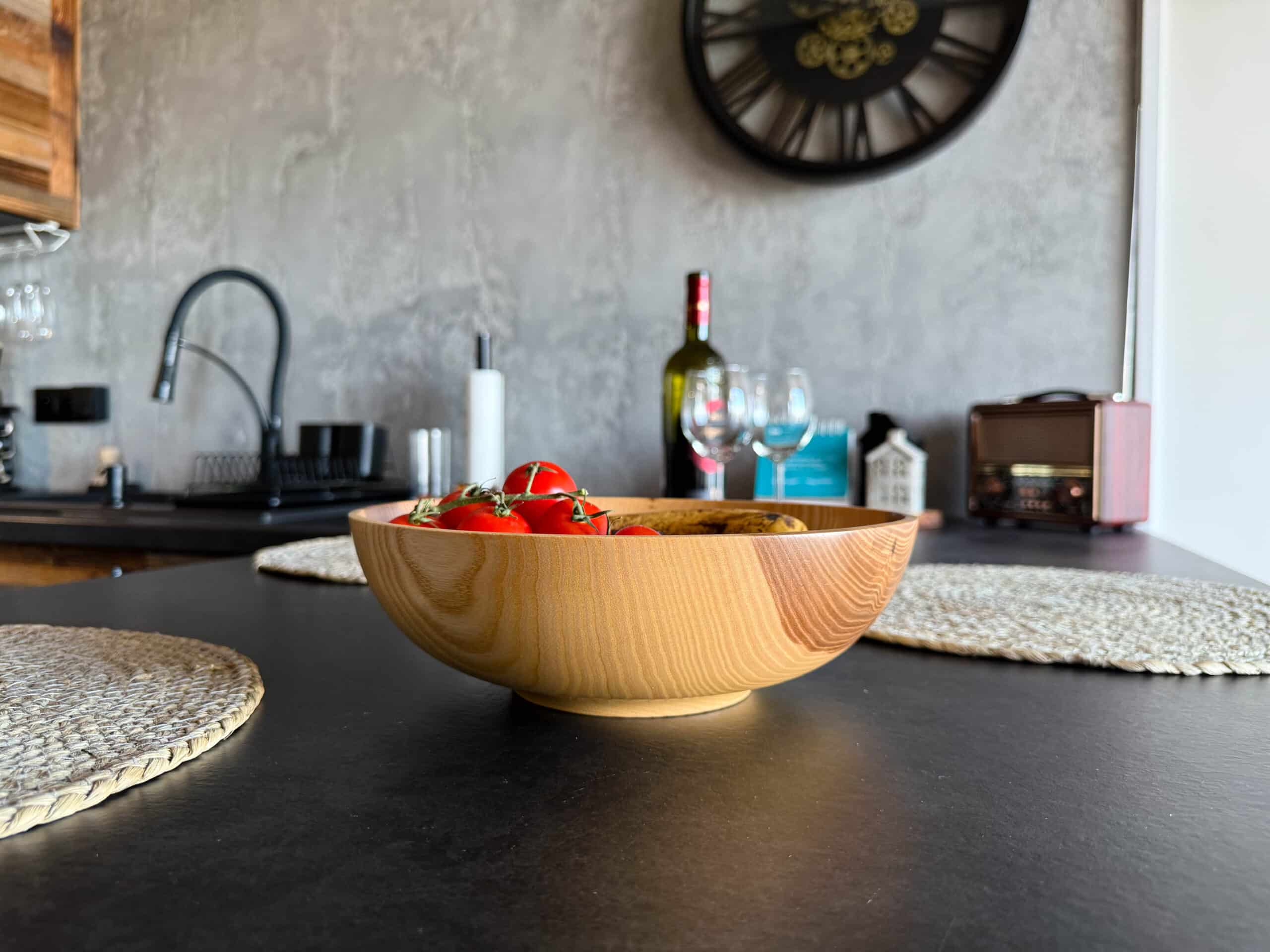 3 miski w różnych rozmiarach, prezentują się naprawdę znakomicie na drewnianej komodzie, mieszczą świeże owoce, warzywa i orzechy. Wykonanie solidnie i ze starannością. Piękne naturalne kolory o miodowym odcieniu.