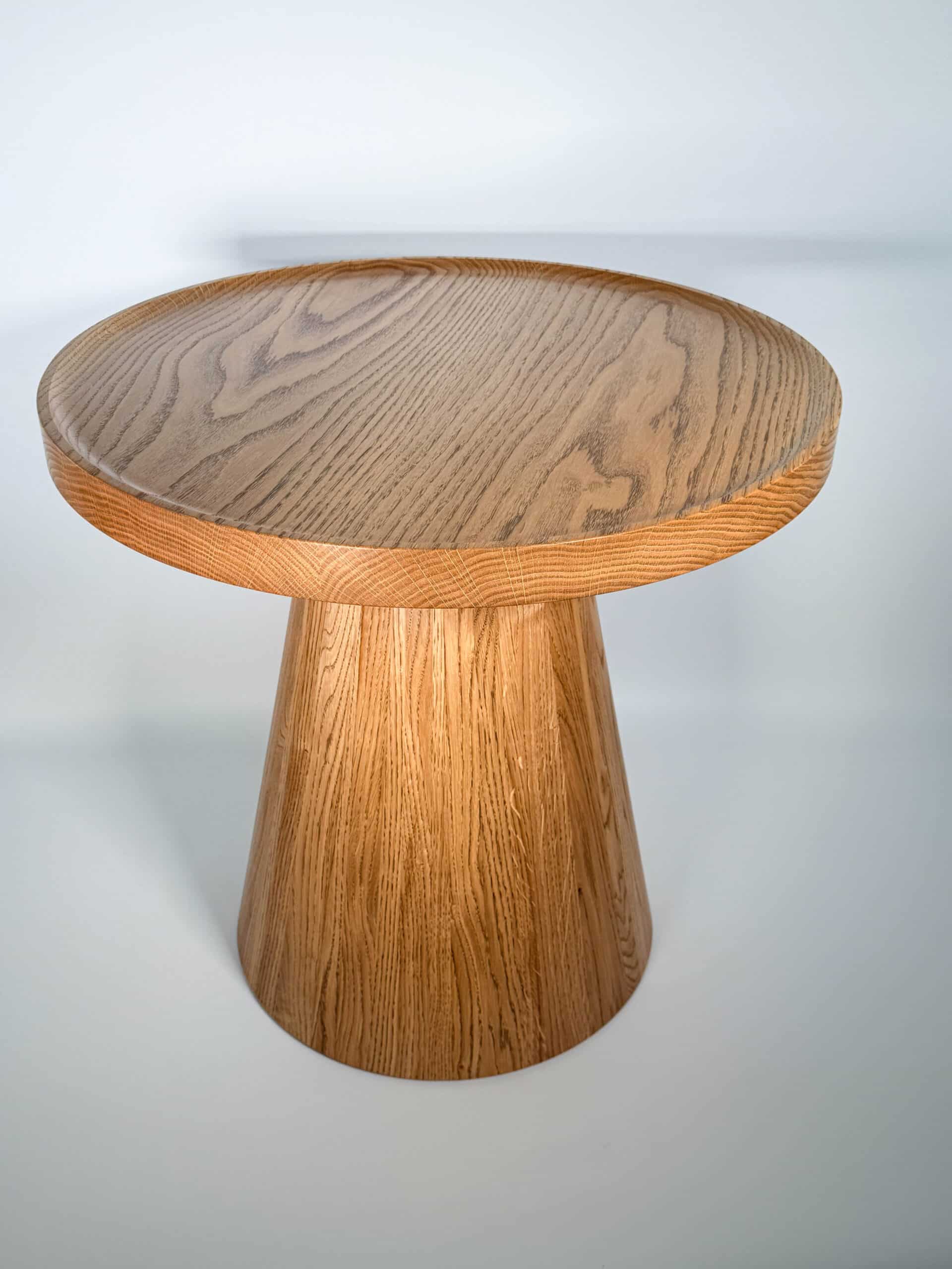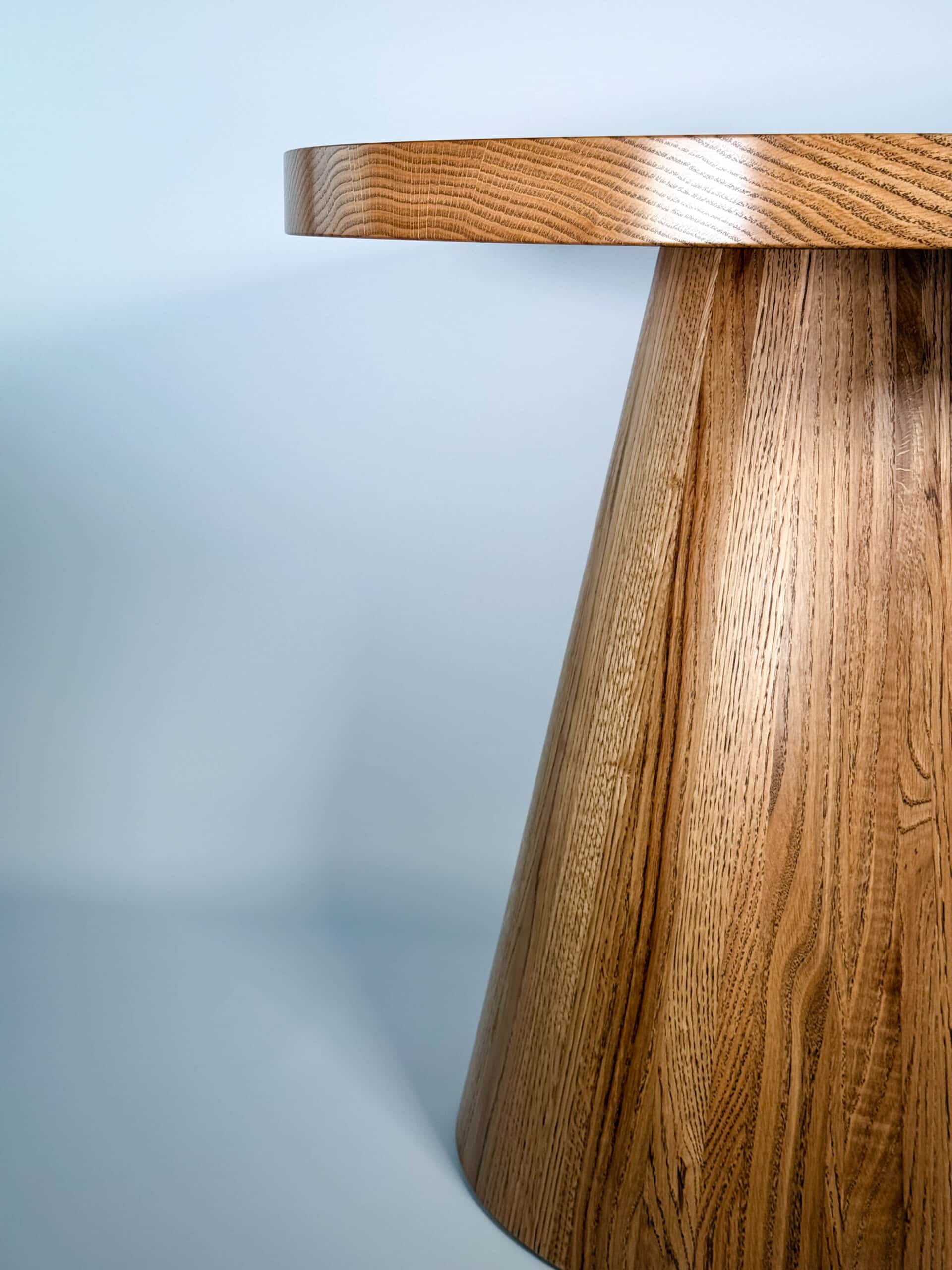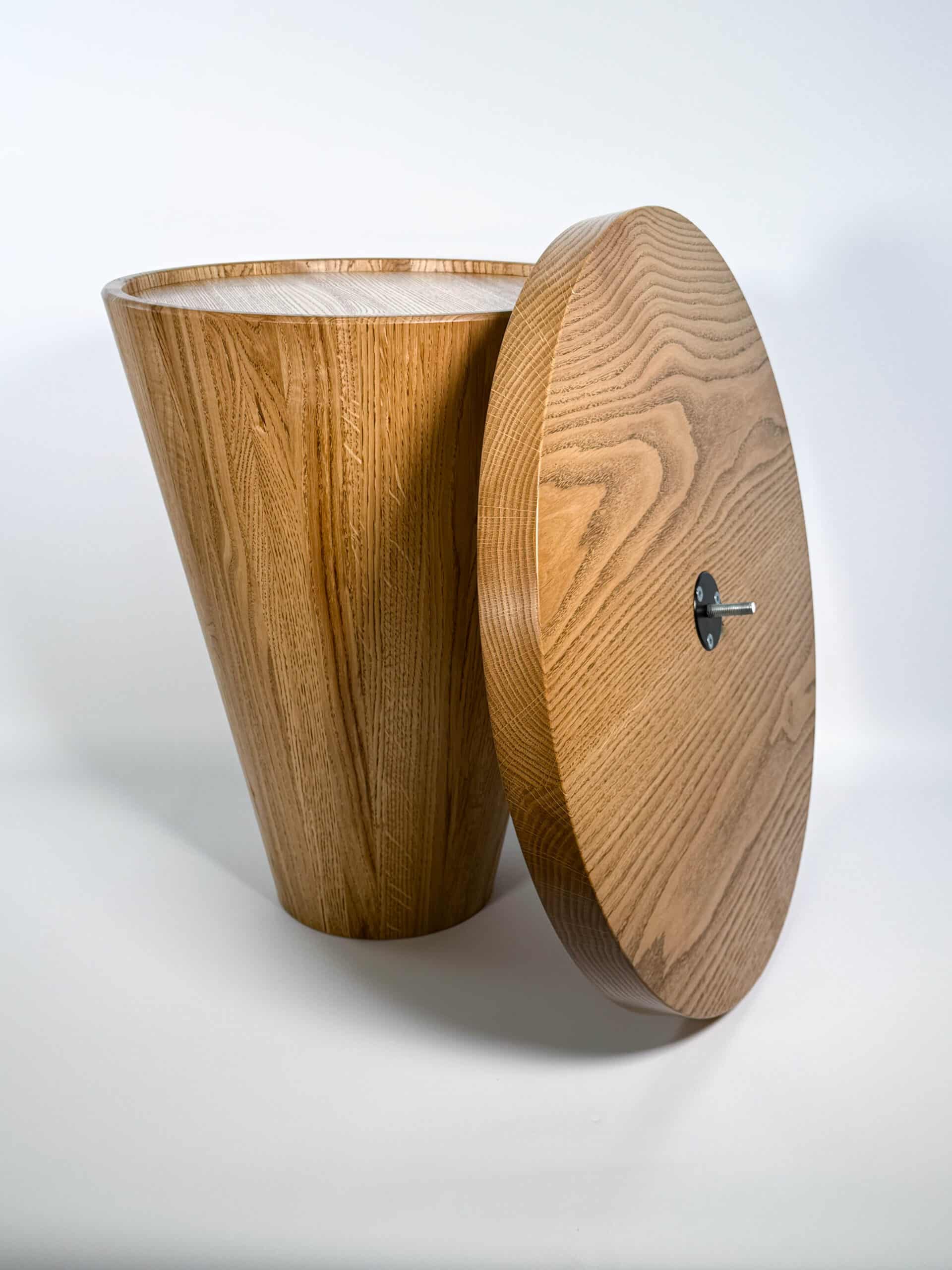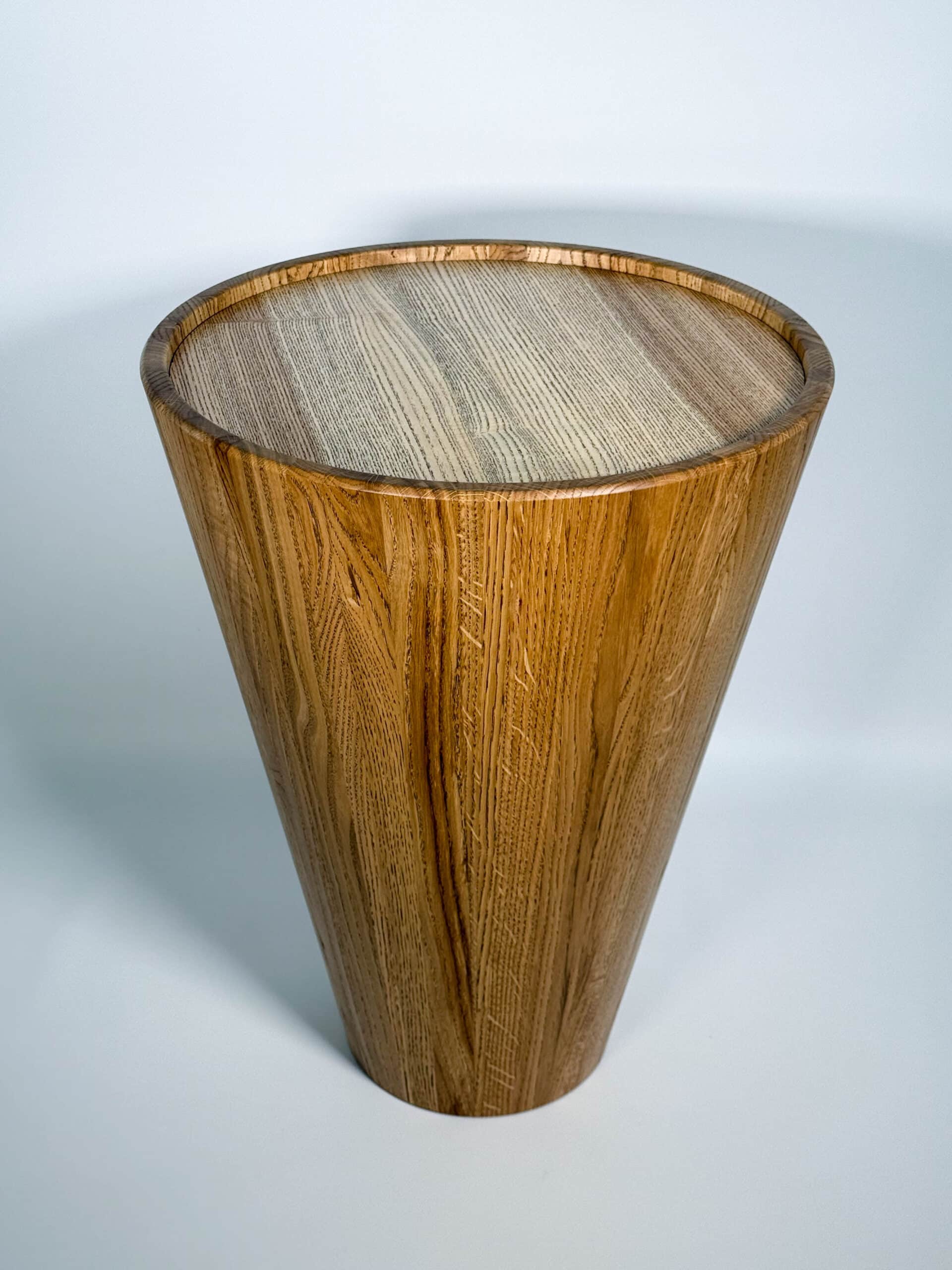Zainspirowana tradycyjnymi technikami bednarskimi (jak te beczki na wino!), noga jest sklejona obwodowo i pusta w środku. Dzięki temu stolik jest lekki, łatwy do przenoszenia, a jednocześnie odporny na spękania. Naturalne, nieregularne słoje drewna dodają autentycznego uroku, sprawiając, że stolik ma swój własny, niepowtarzalny charakter.