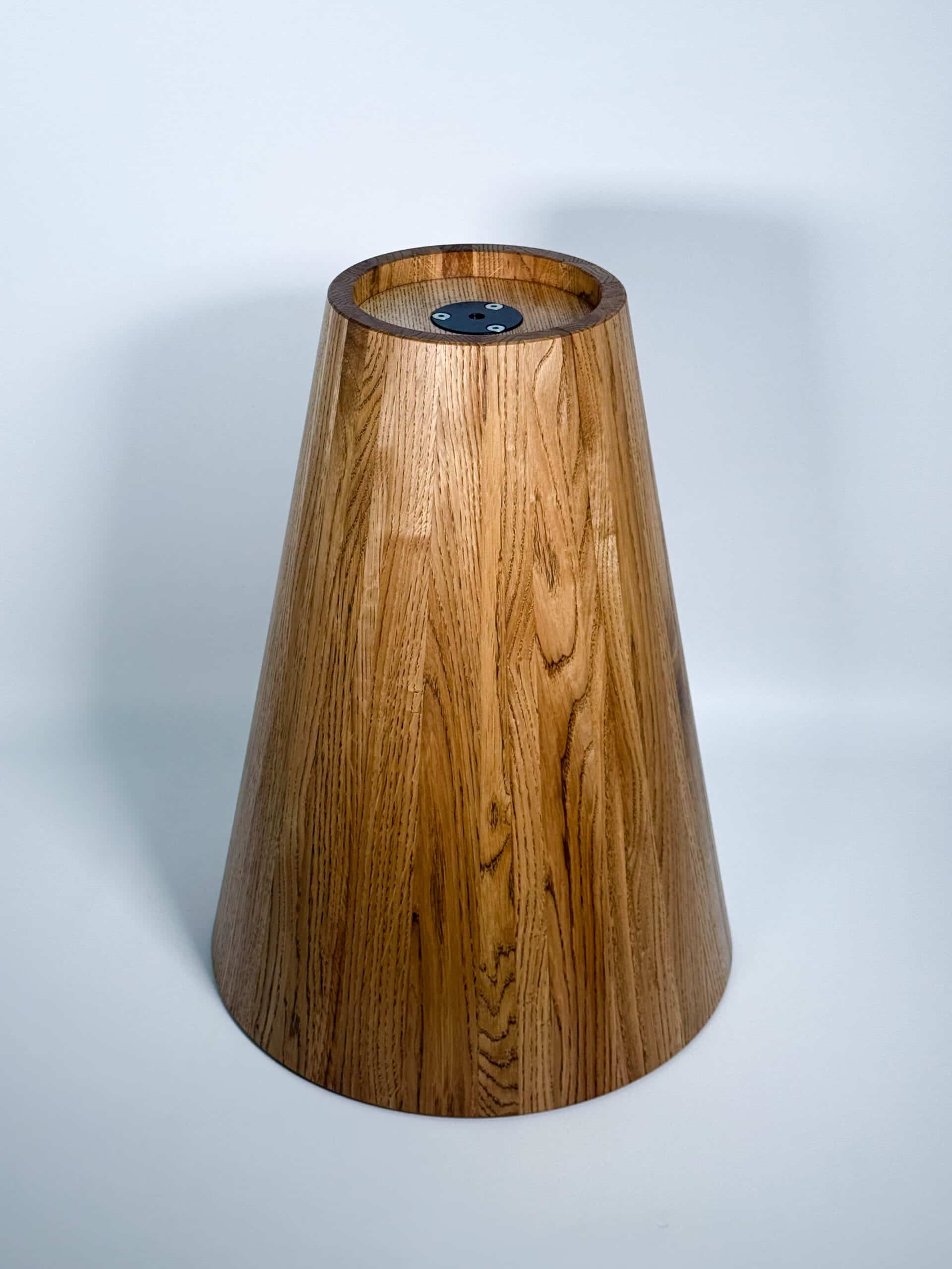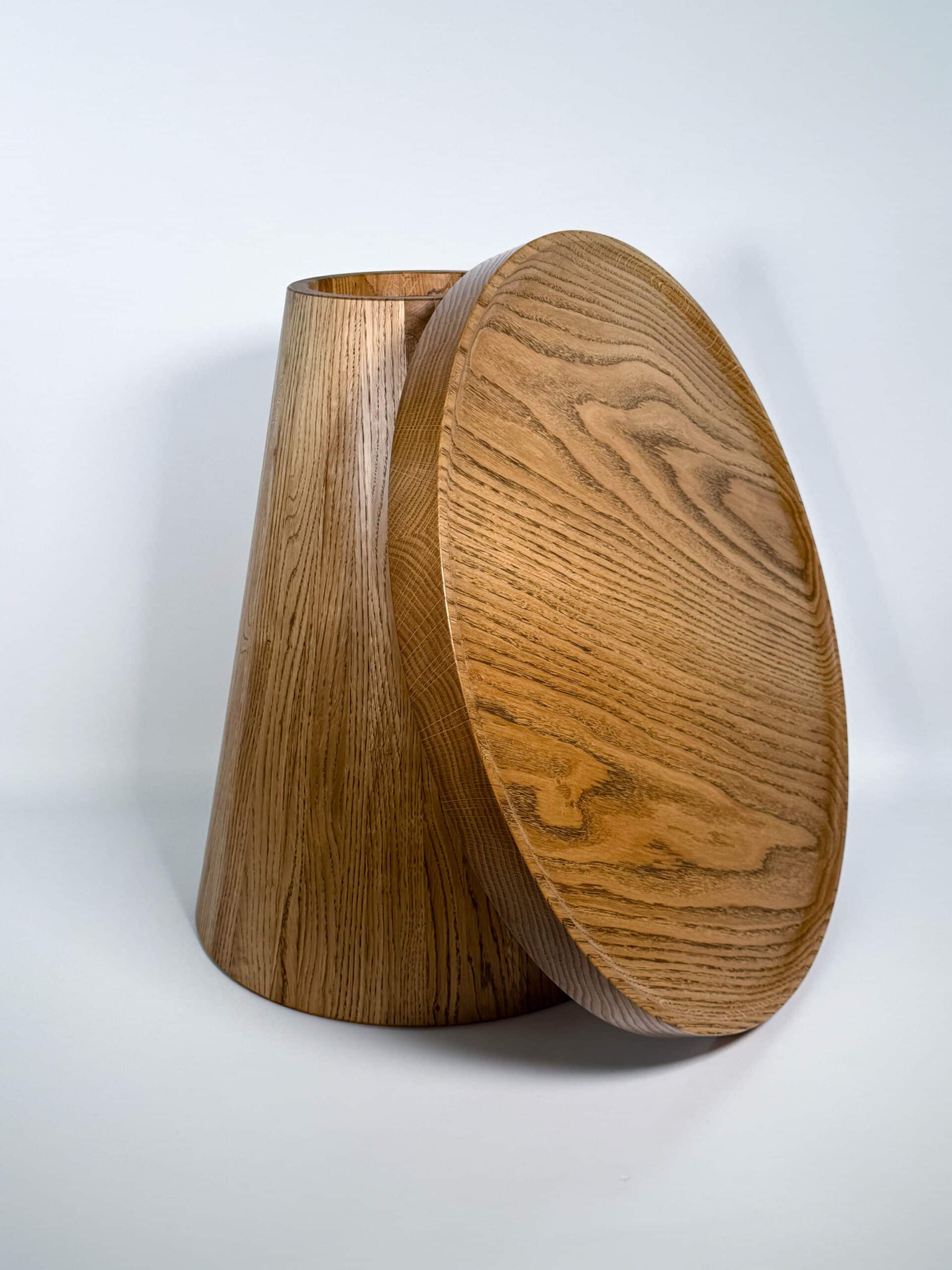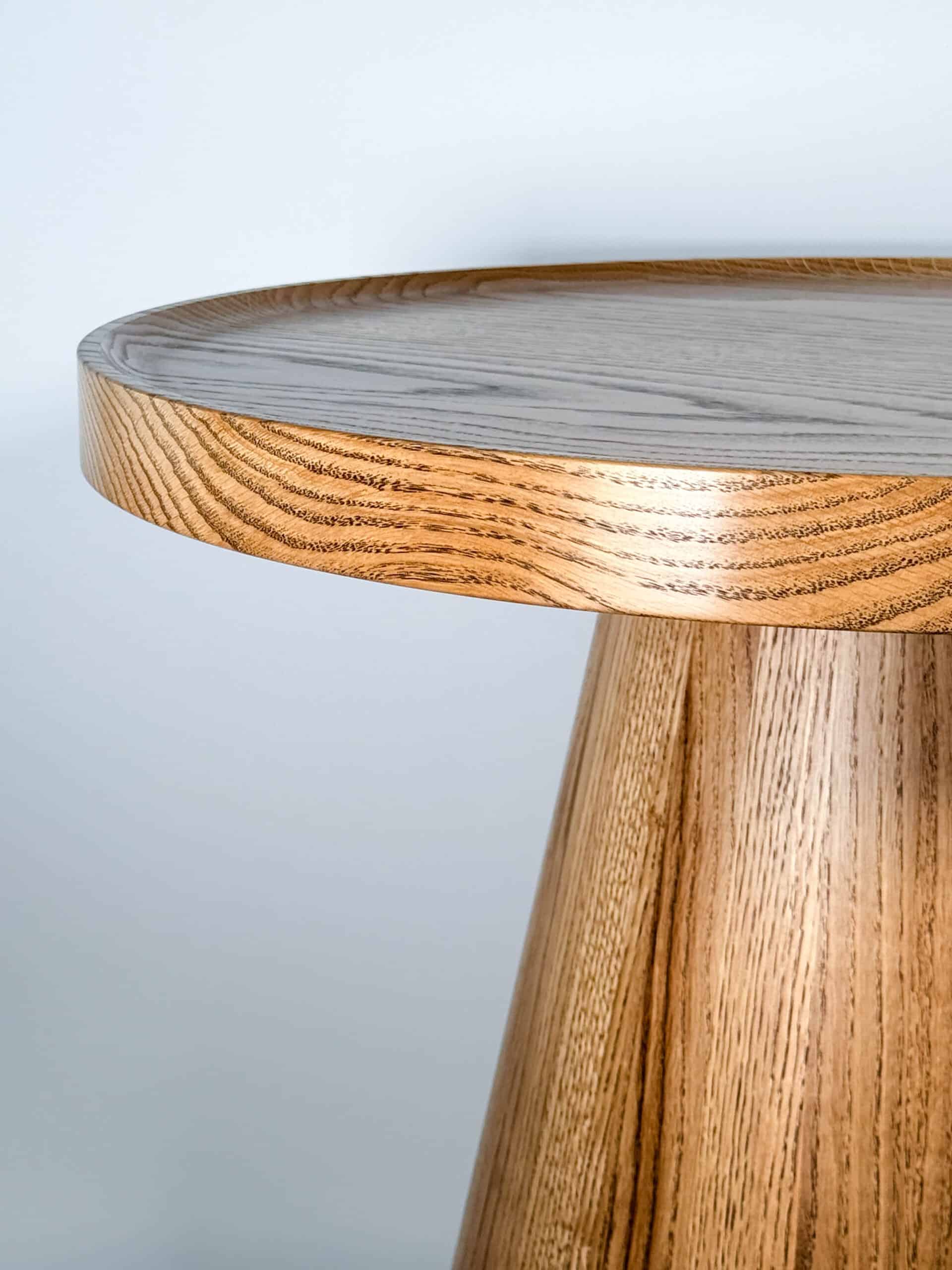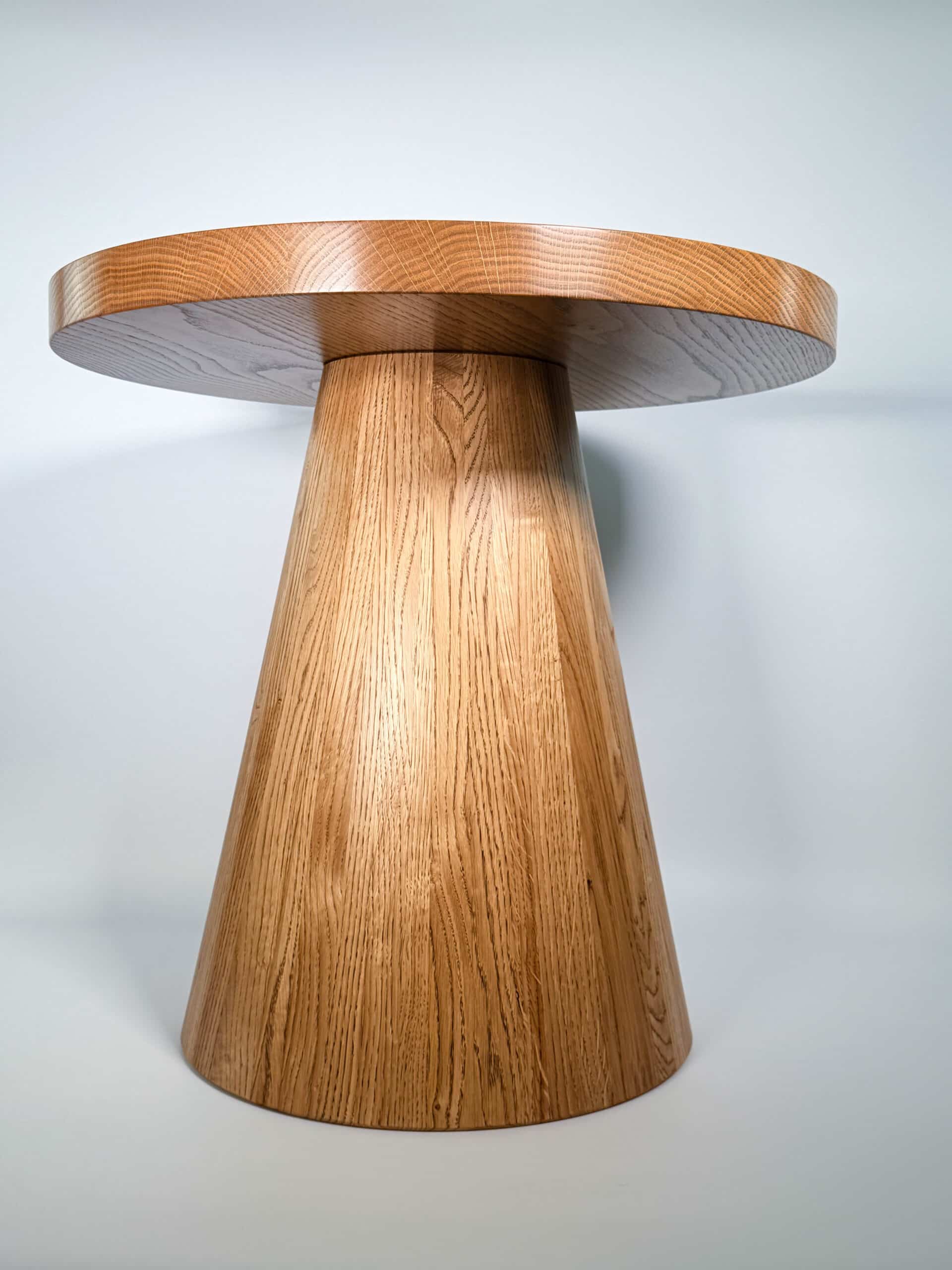 Zainspirowana tradycyjnymi technikami bednarskimi (jak te beczki na wino!), noga jest sklejona obwodowo i pusta w środku. Dzięki temu stolik jest lekki, łatwy do przenoszenia, a jednocześnie odporny na spękania. Naturalne, nieregularne słoje drewna dodają autentycznego uroku, sprawiając, że stolik ma swój własny, niepowtarzalny charakter.
