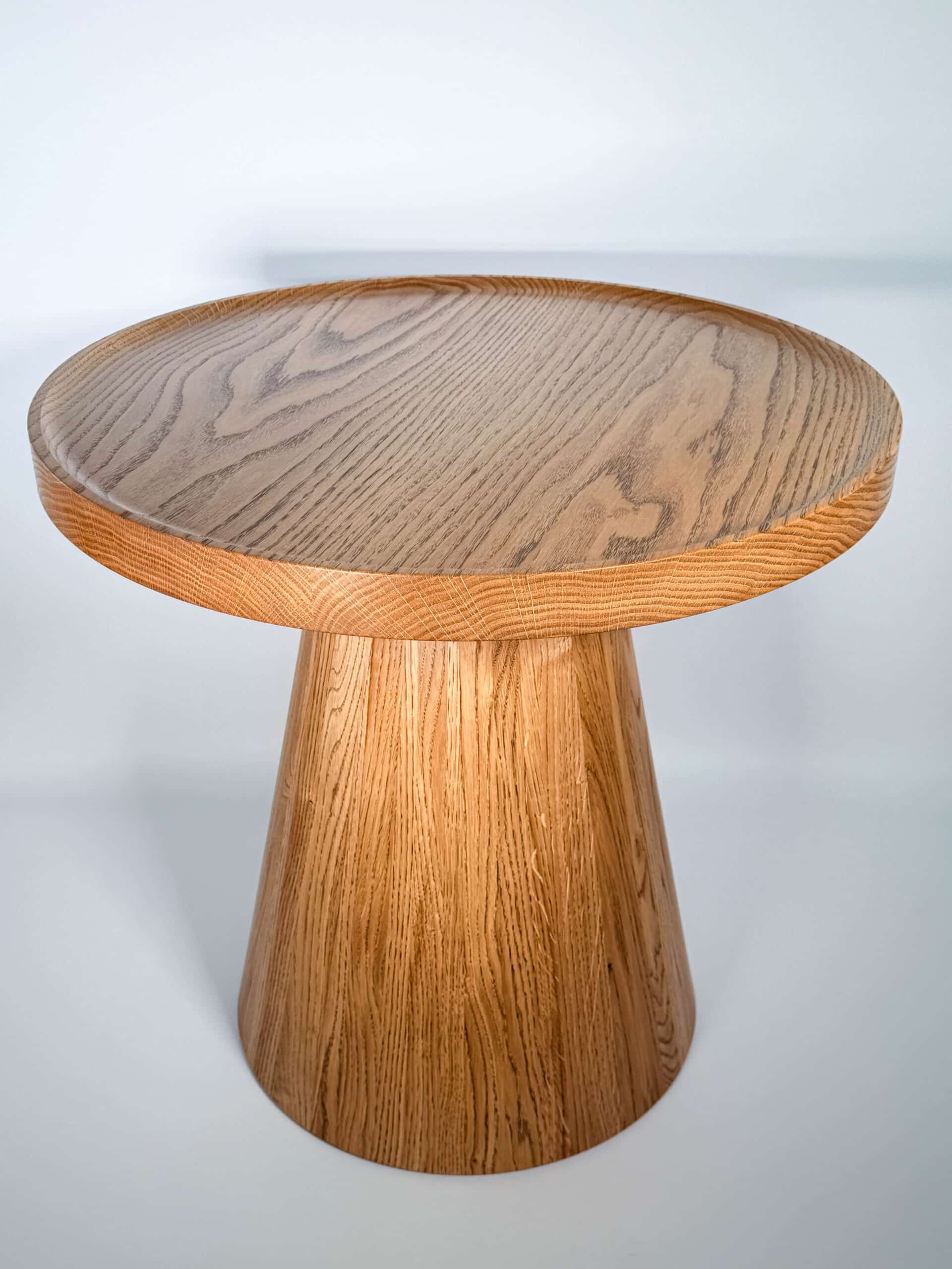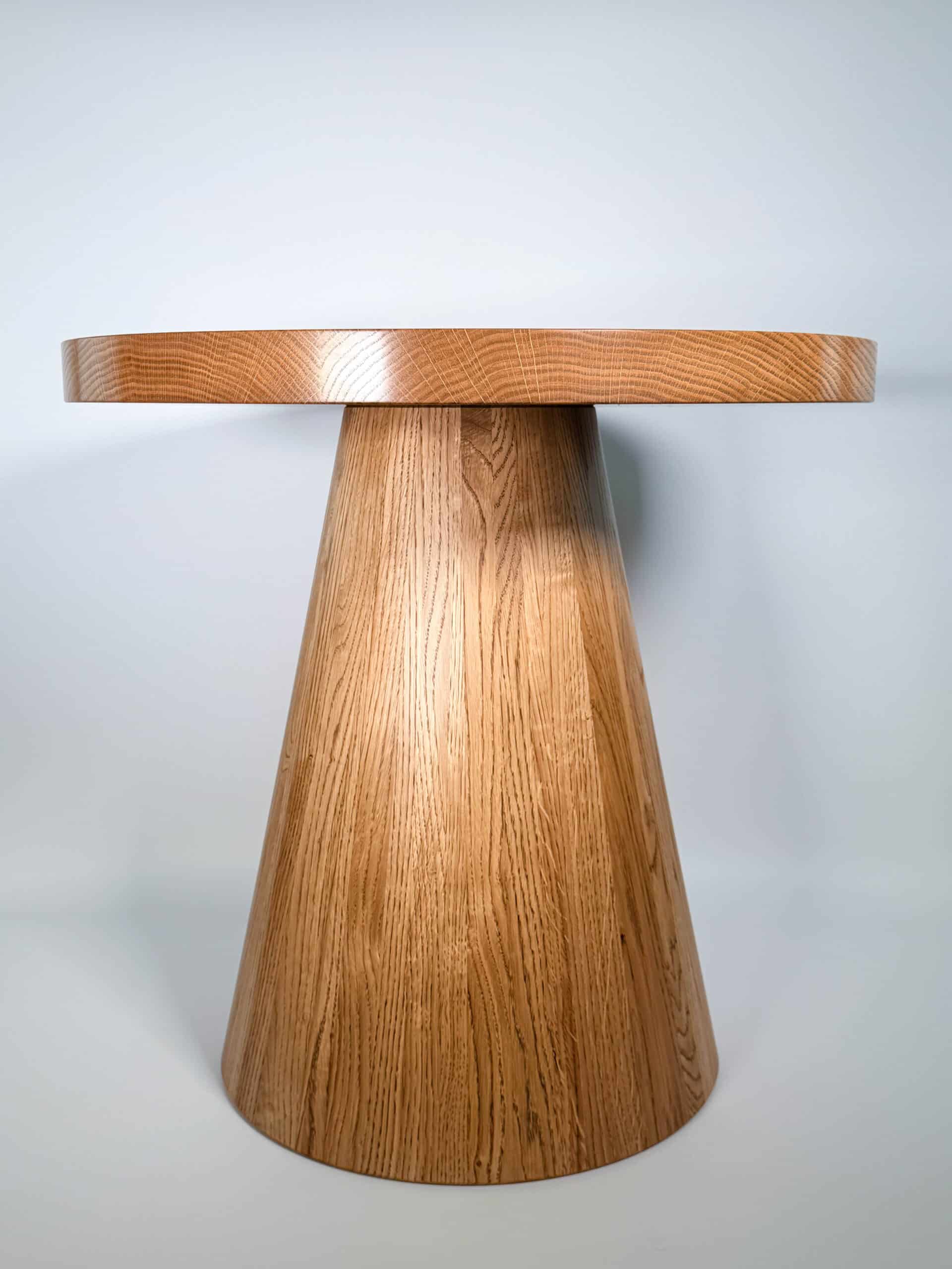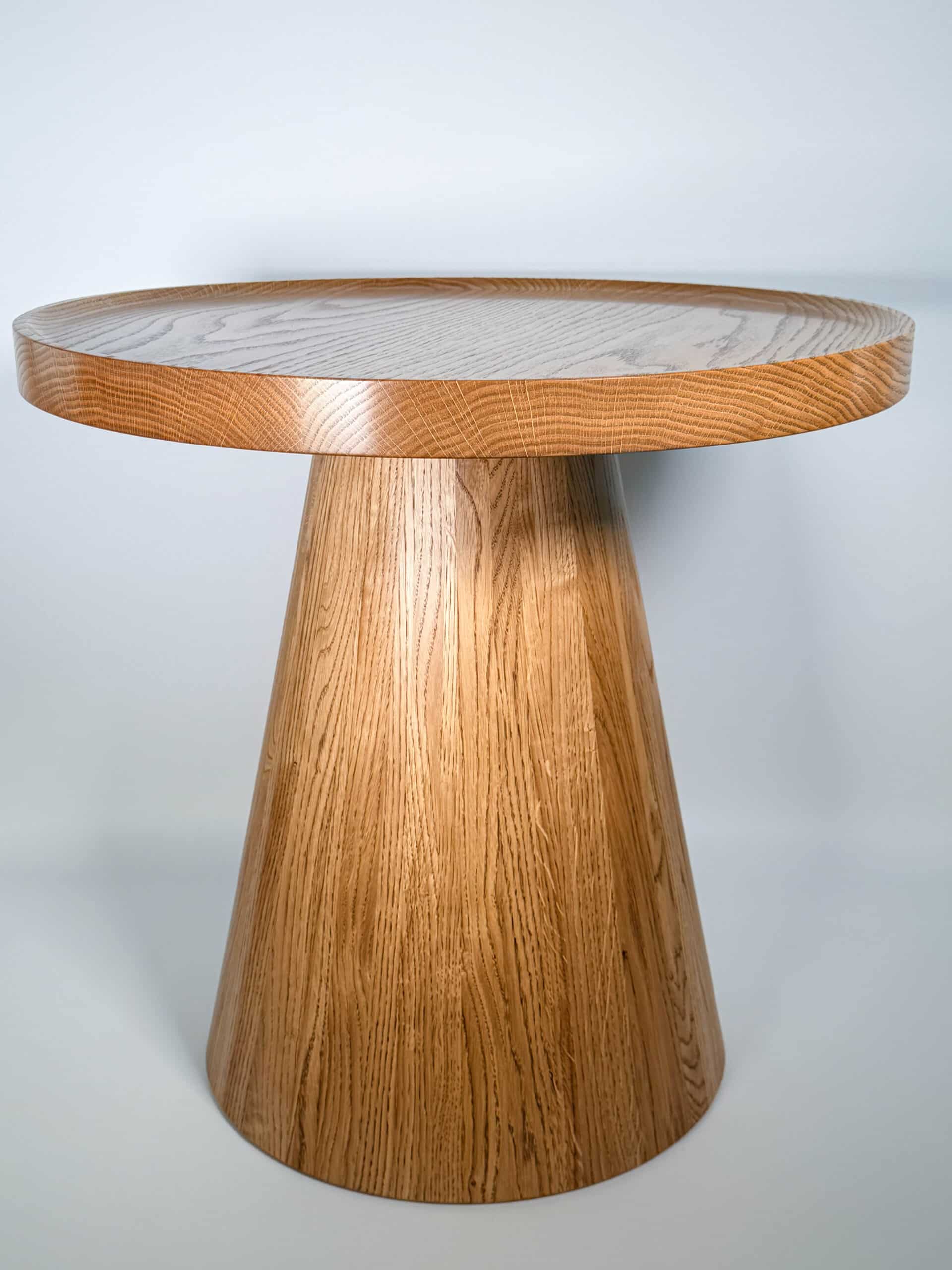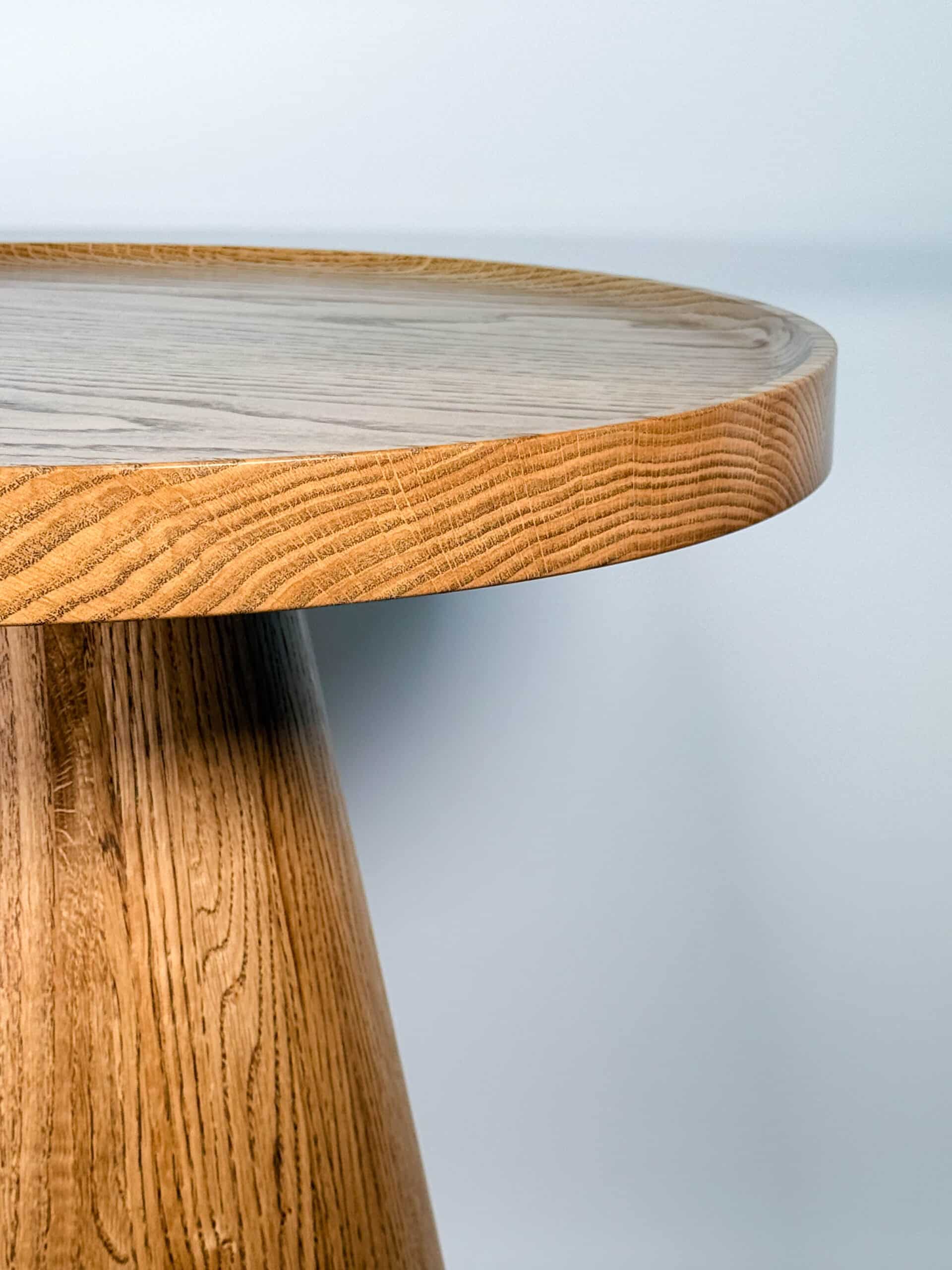 Noga stolika „Dębowy Urok” ma elegancki, stożkowy kształt, toczona z litego drewna dębowego, dzięki czemu stolik zyskuje subtelny i wyjątkowy charakter – trochę jakby sam zapraszał na filiżankę kawy!