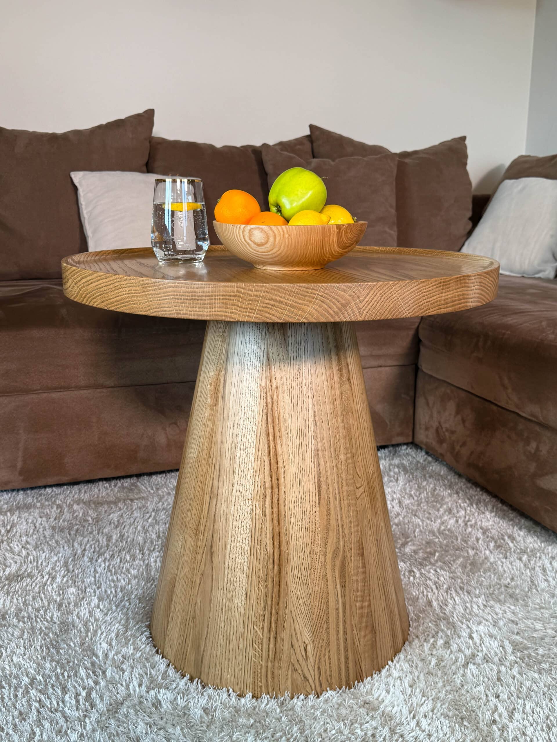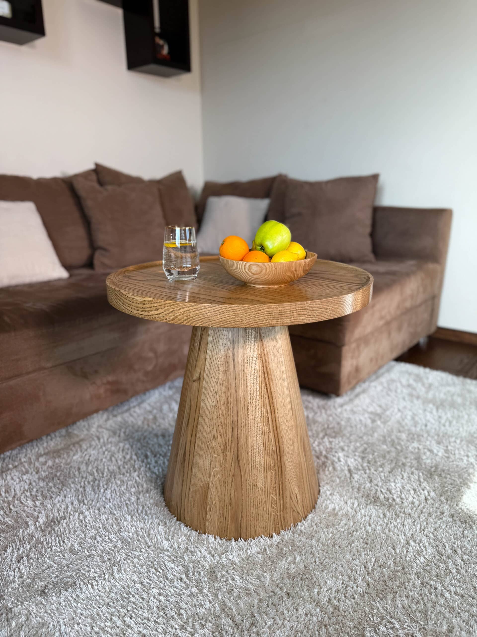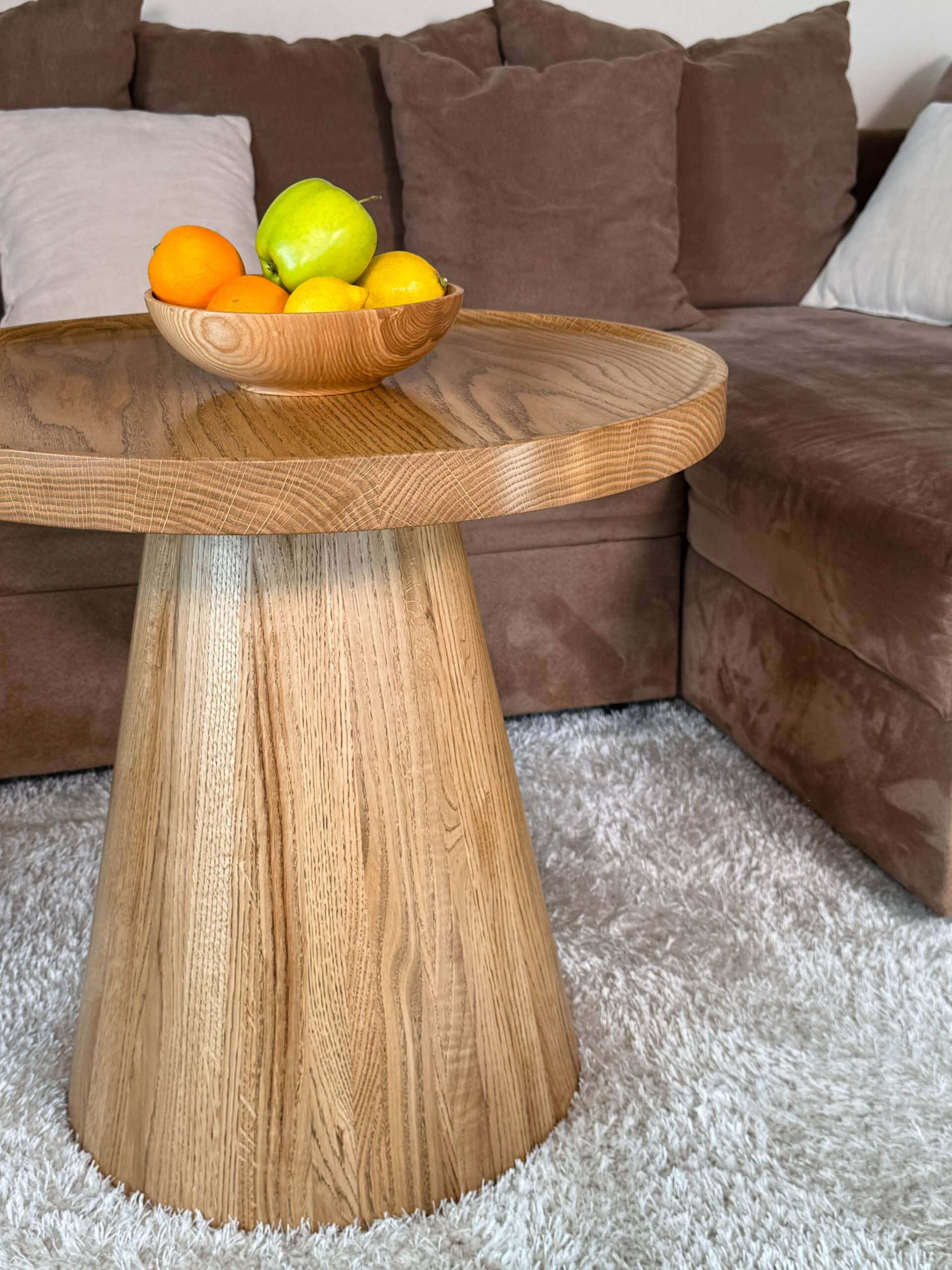 Noga stolika „Dębowy Urok” ma elegancki, stożkowy kształt, toczona z litego drewna dębowego, dzięki czemu stolik zyskuje subtelny i wyjątkowy charakter – trochę jakby sam zapraszał na filiżankę kawy!