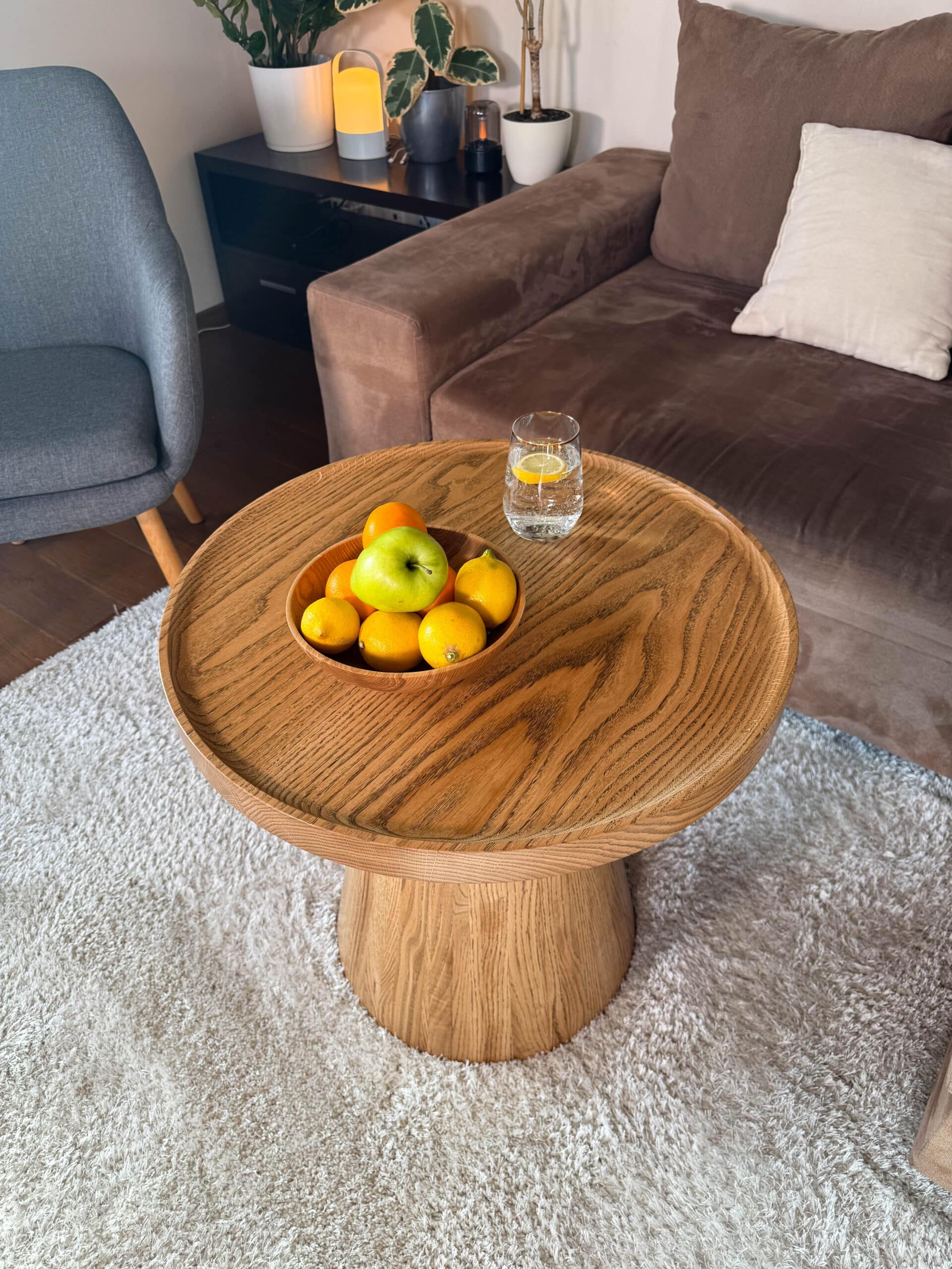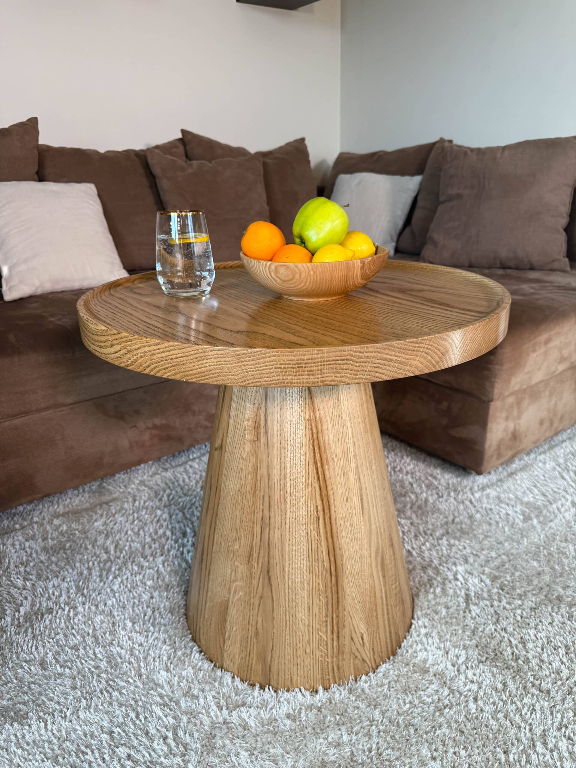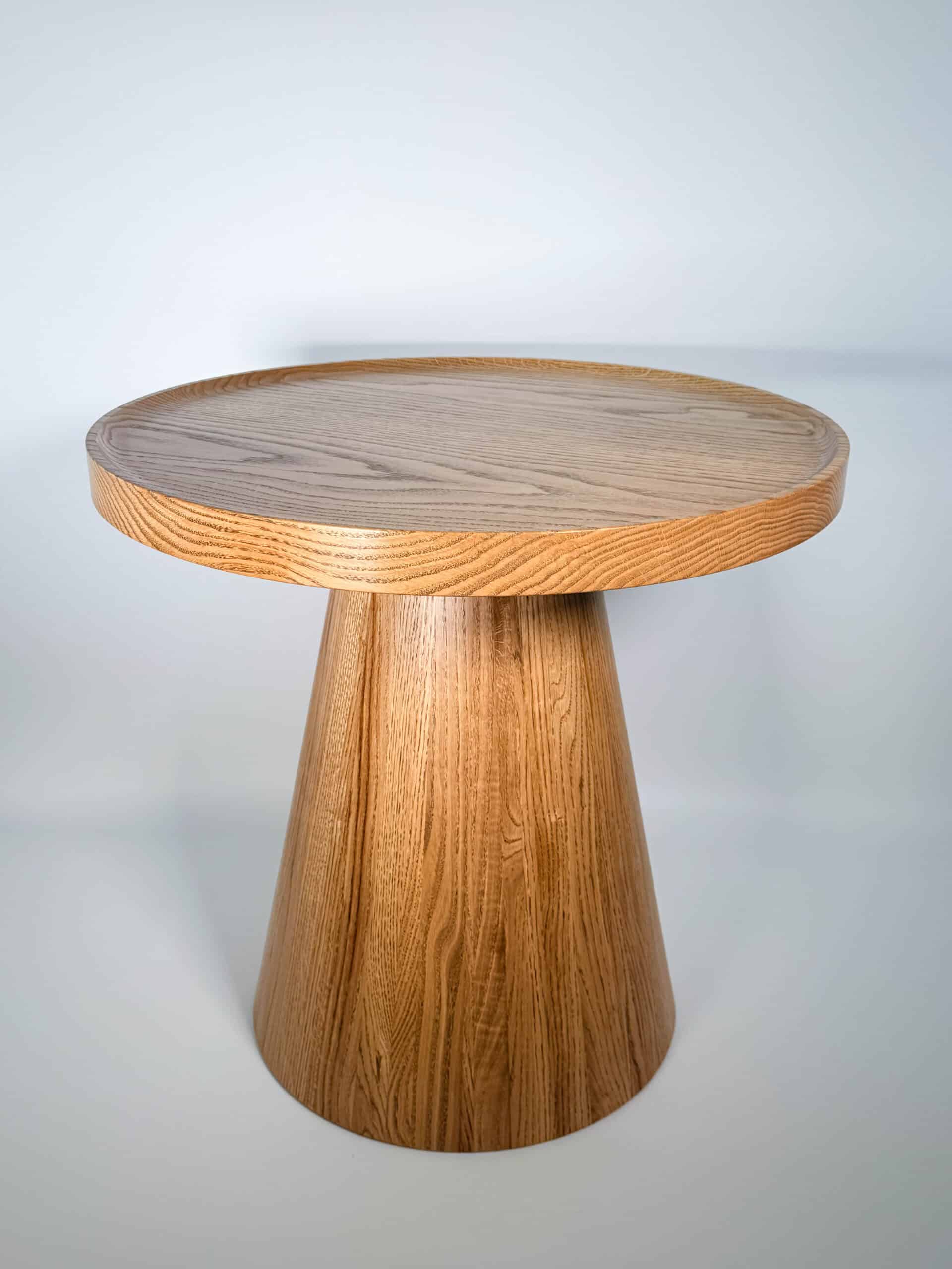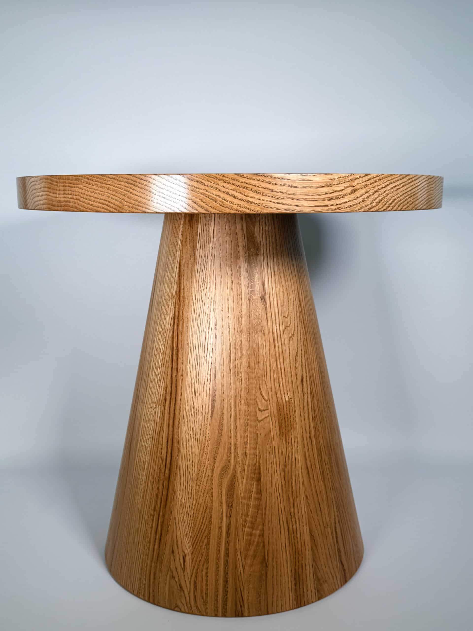 Noga stolika „Dębowy Urok” ma elegancki, stożkowy kształt, toczona z litego drewna dębowego, dzięki czemu stolik zyskuje subtelny i wyjątkowy charakter – trochę jakby sam zapraszał na filiżankę kawy!