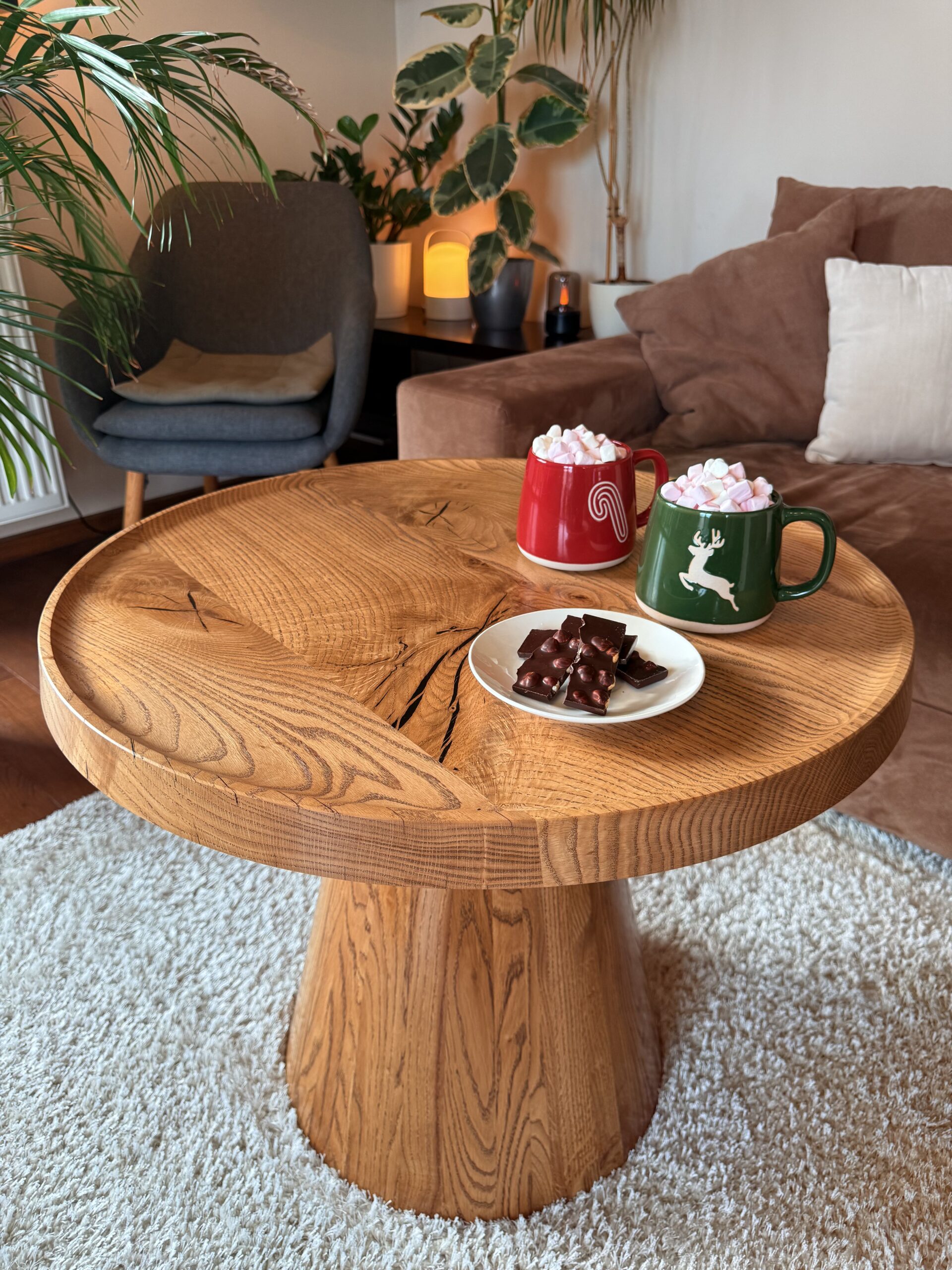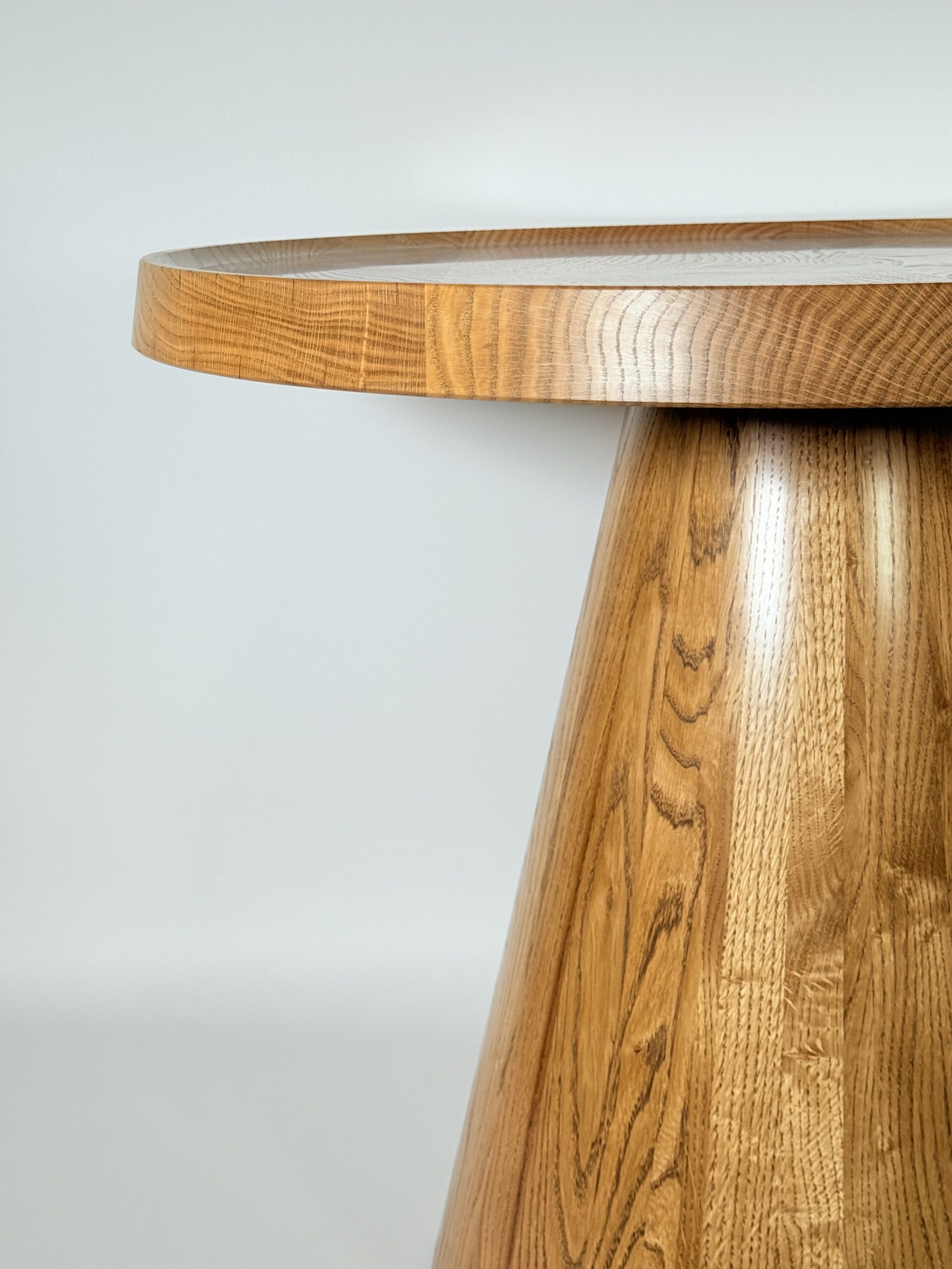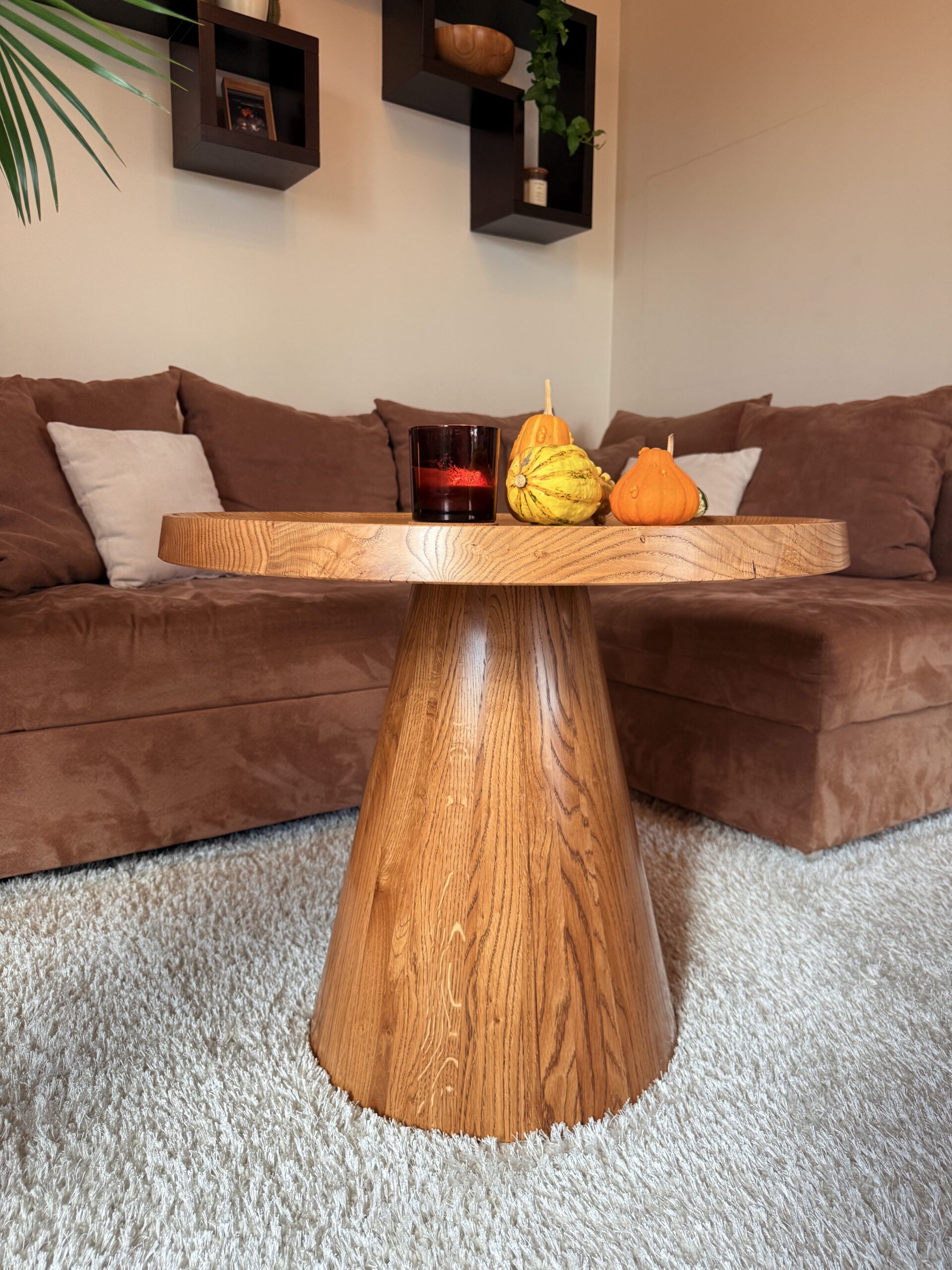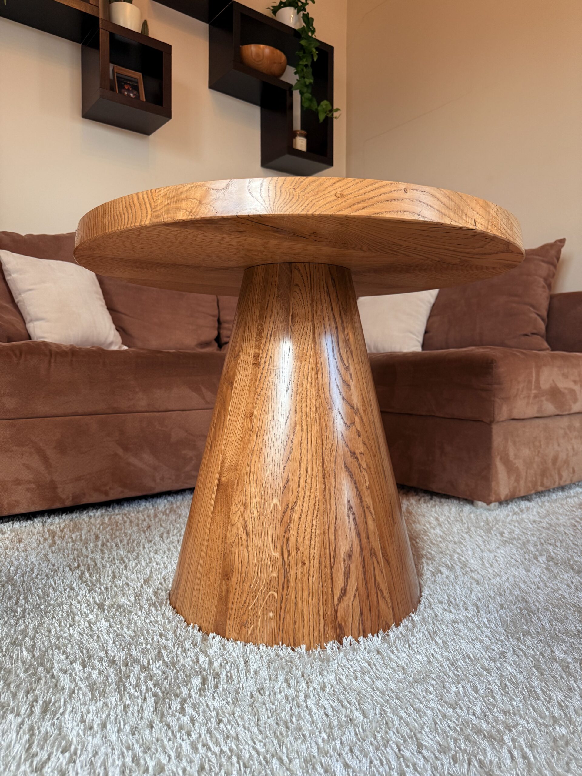 Noga stolika „Dębowy Urok” ma elegancki, stożkowy kształt, toczona z litego drewna dębowego, dzięki czemu stolik zyskuje subtelny i wyjątkowy charakter – trochę jakby sam zapraszał na filiżankę kawy!