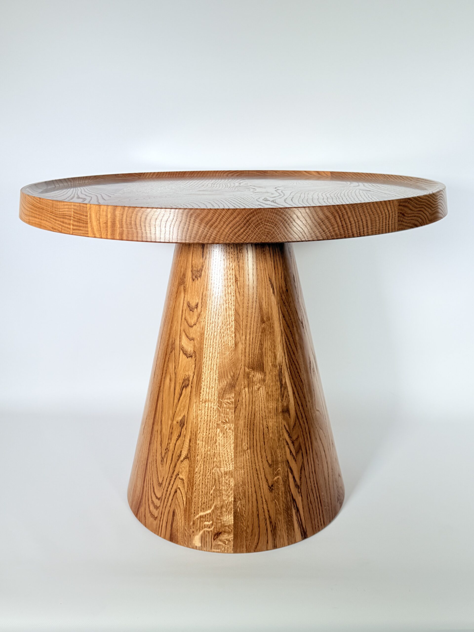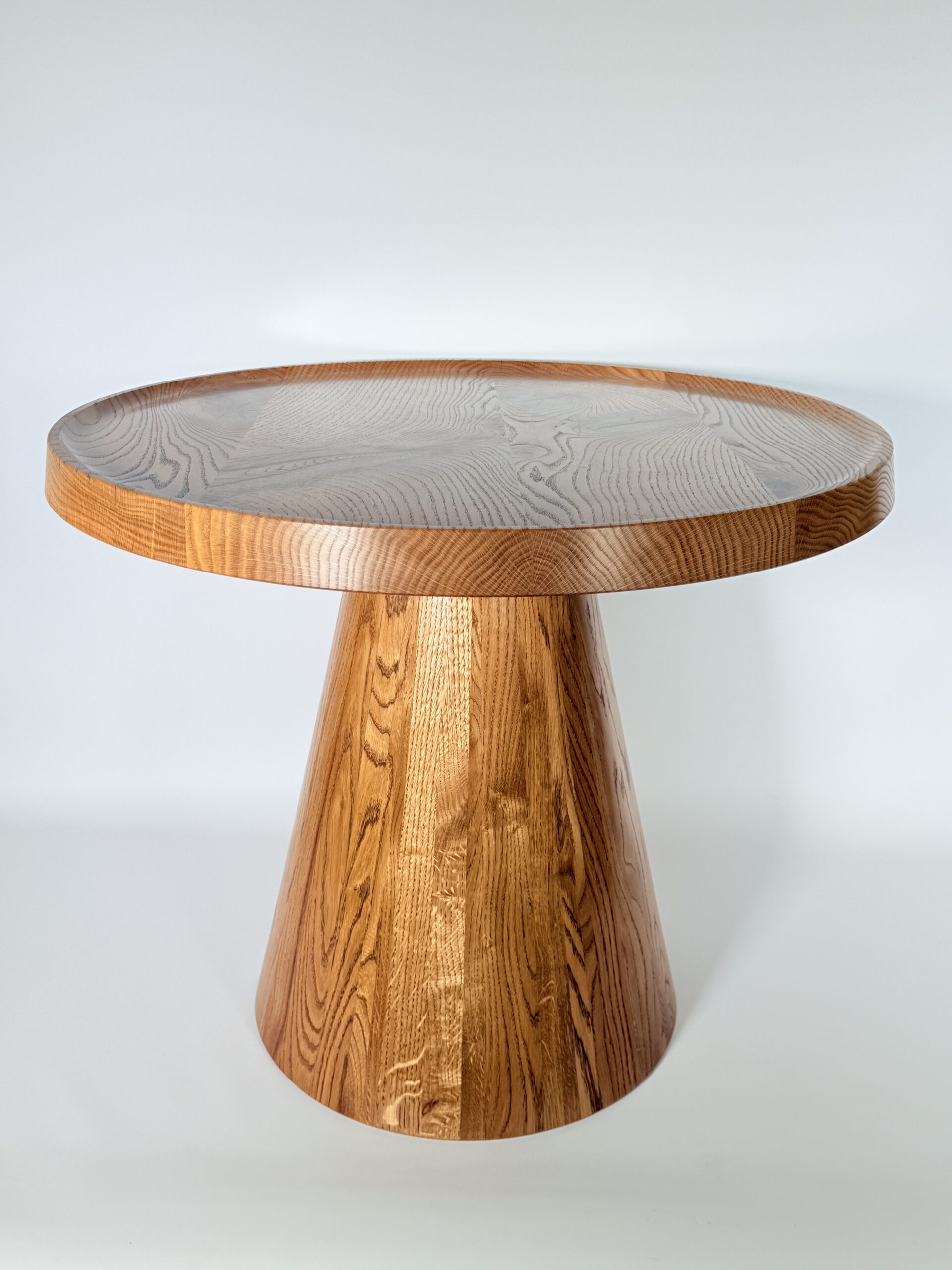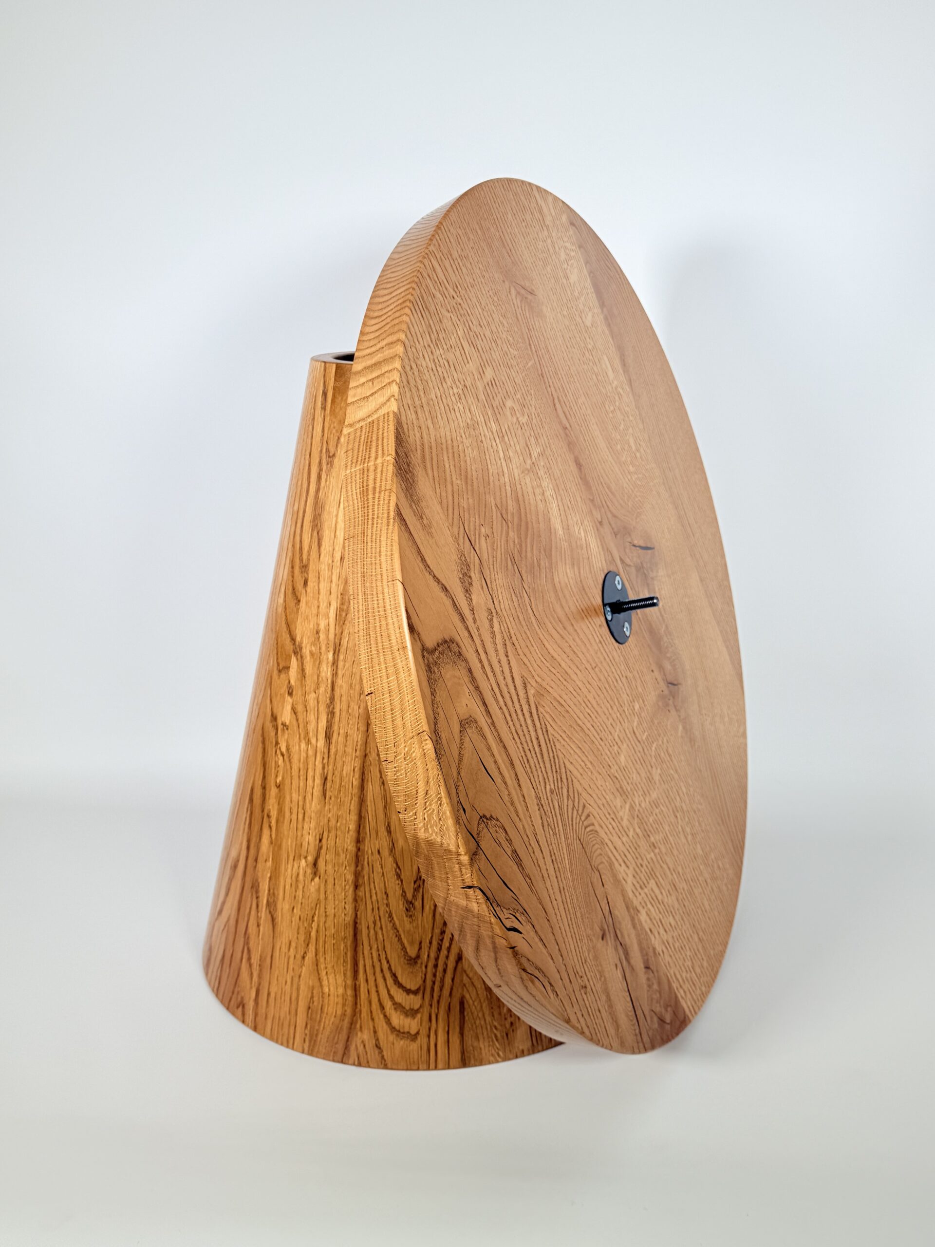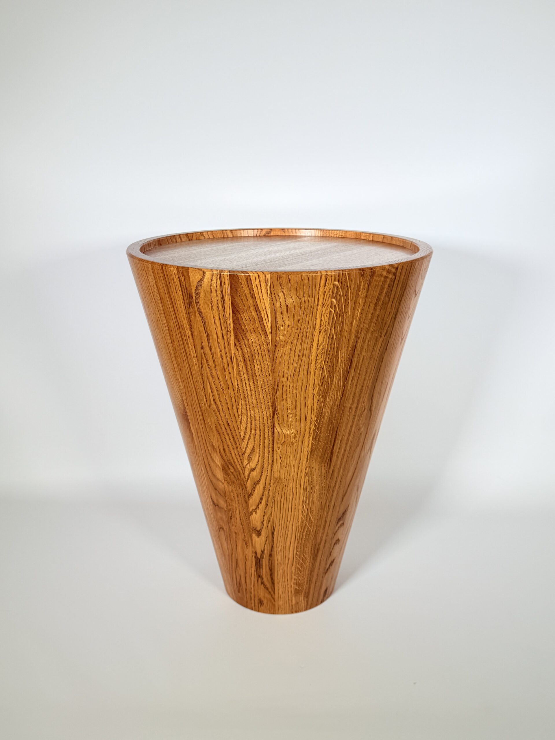 Zainspirowana tradycyjnymi technikami bednarskimi (jak te beczki na wino!), noga jest sklejona obwodowo i pusta w środku. Dzięki temu stolik jest lekki, łatwy do przenoszenia, a jednocześnie odporny na spękania. Naturalne, nieregularne słoje drewna dodają autentycznego uroku, sprawiając, że stolik ma swój własny, niepowtarzalny charakter.