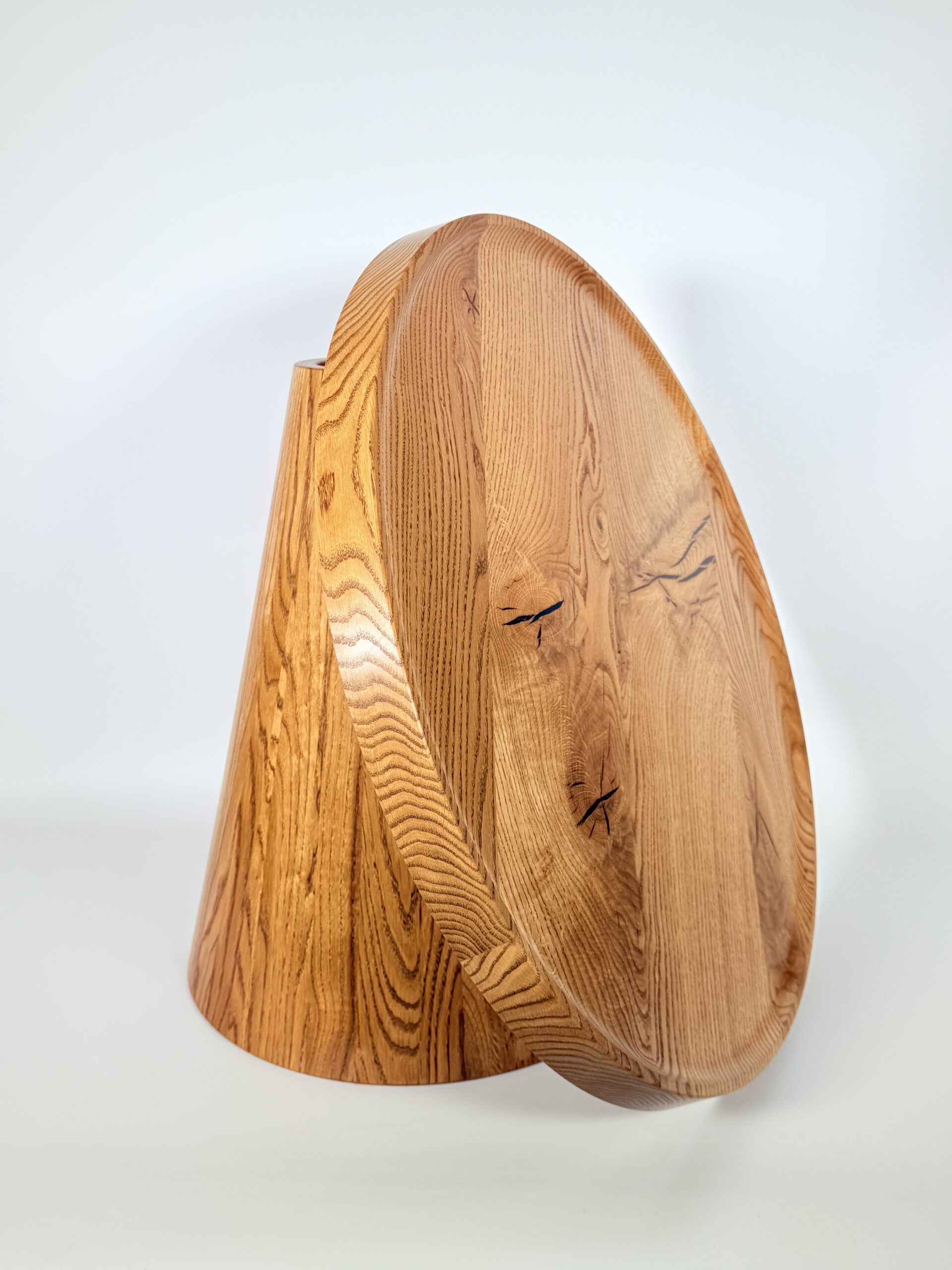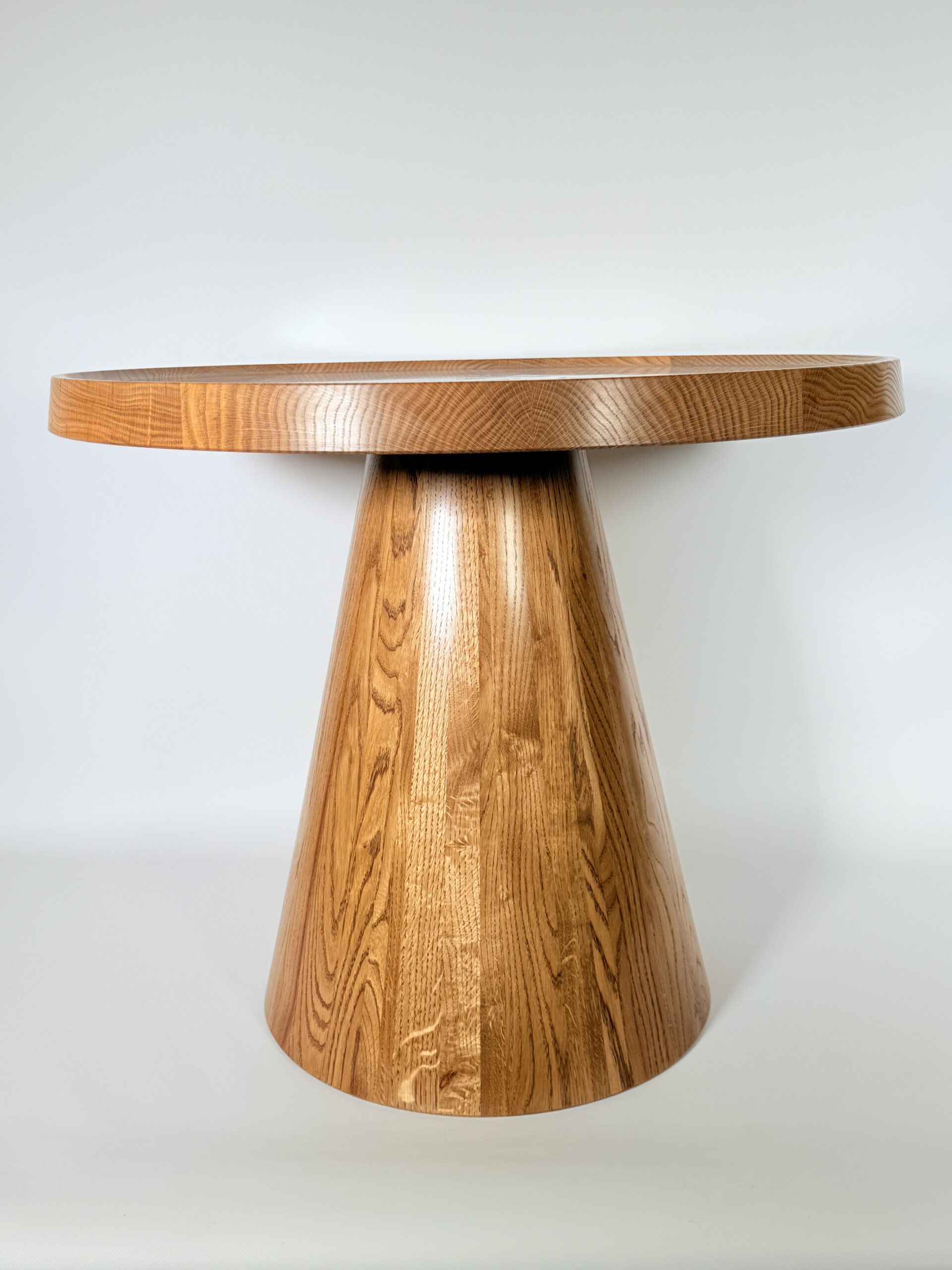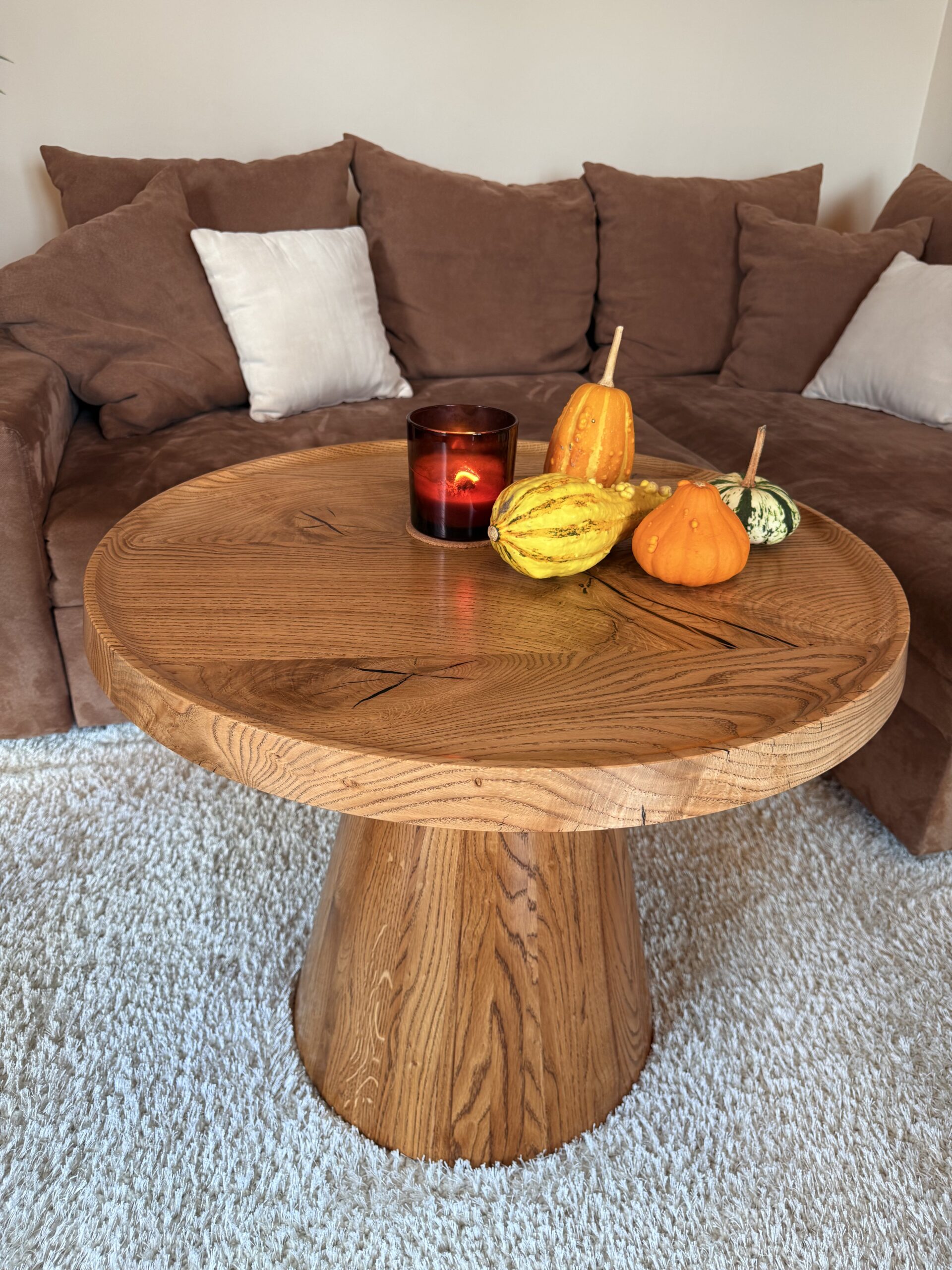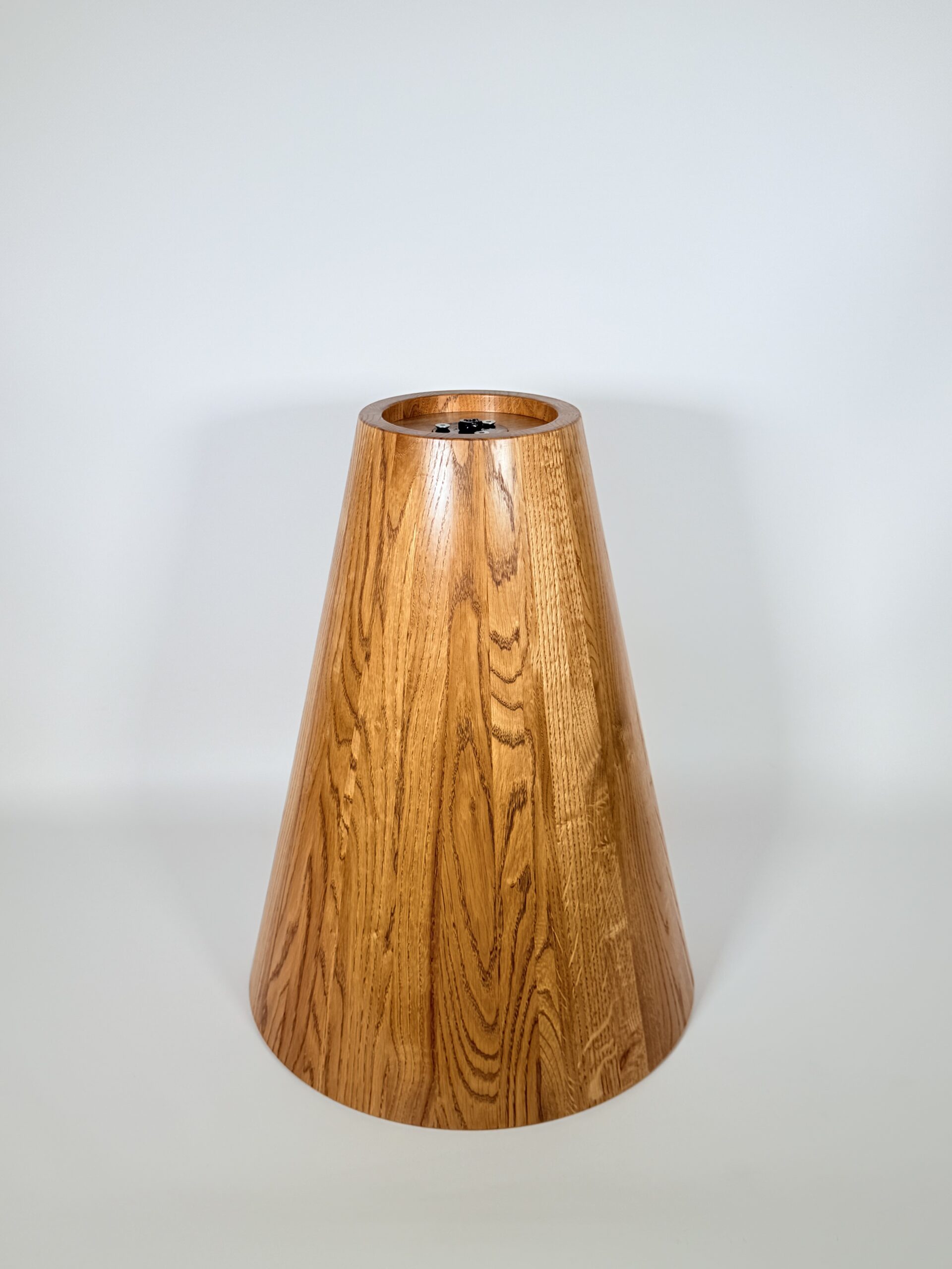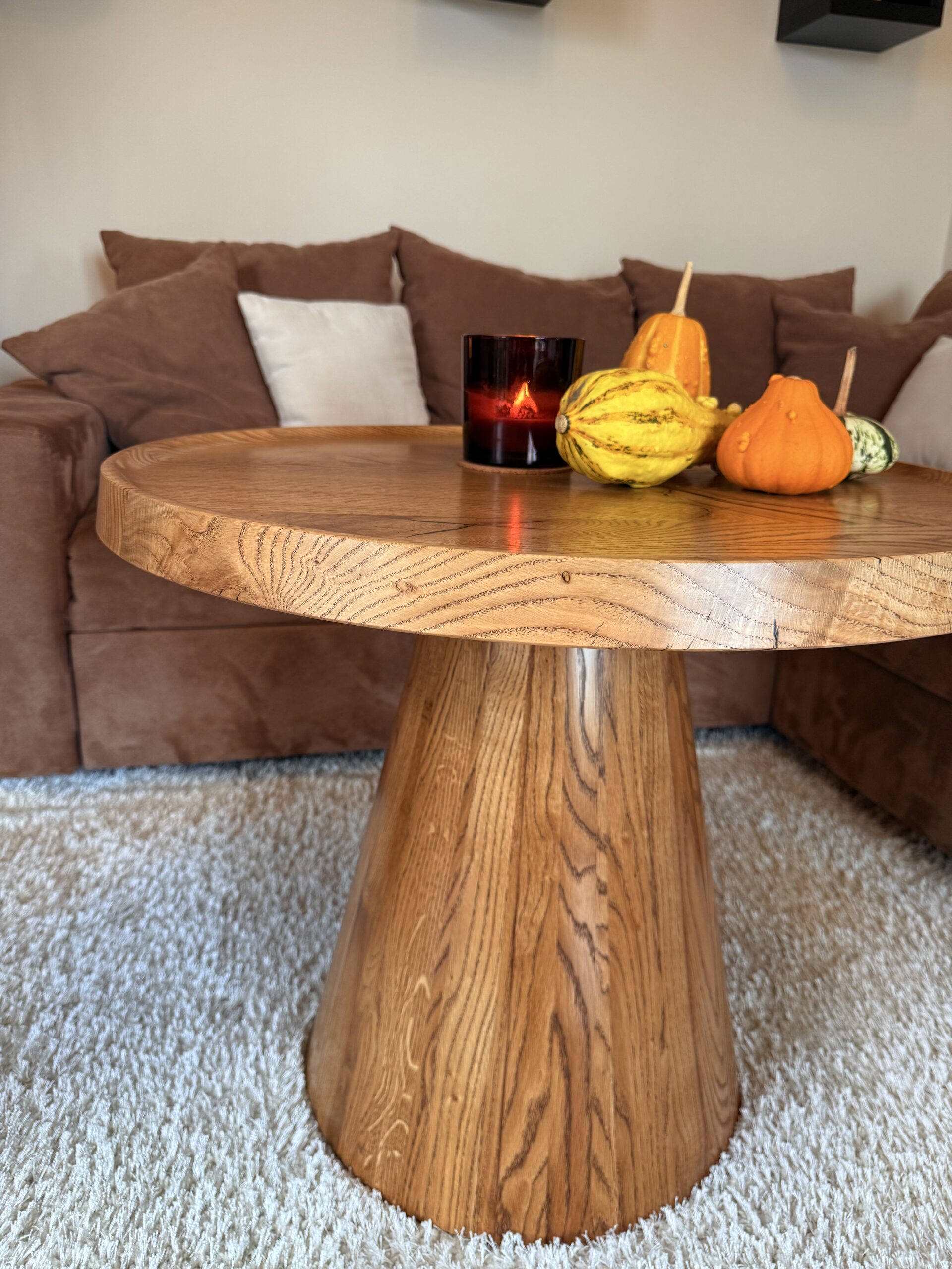 Zainspirowana tradycyjnymi technikami bednarskimi (jak te beczki na wino!), noga jest sklejona obwodowo i pusta w środku. Dzięki temu stolik jest lekki, łatwy do przenoszenia, a jednocześnie odporny na spękania. Naturalne, nieregularne słoje drewna dodają autentycznego uroku, sprawiając, że stolik ma swój własny, niepowtarzalny charakter.